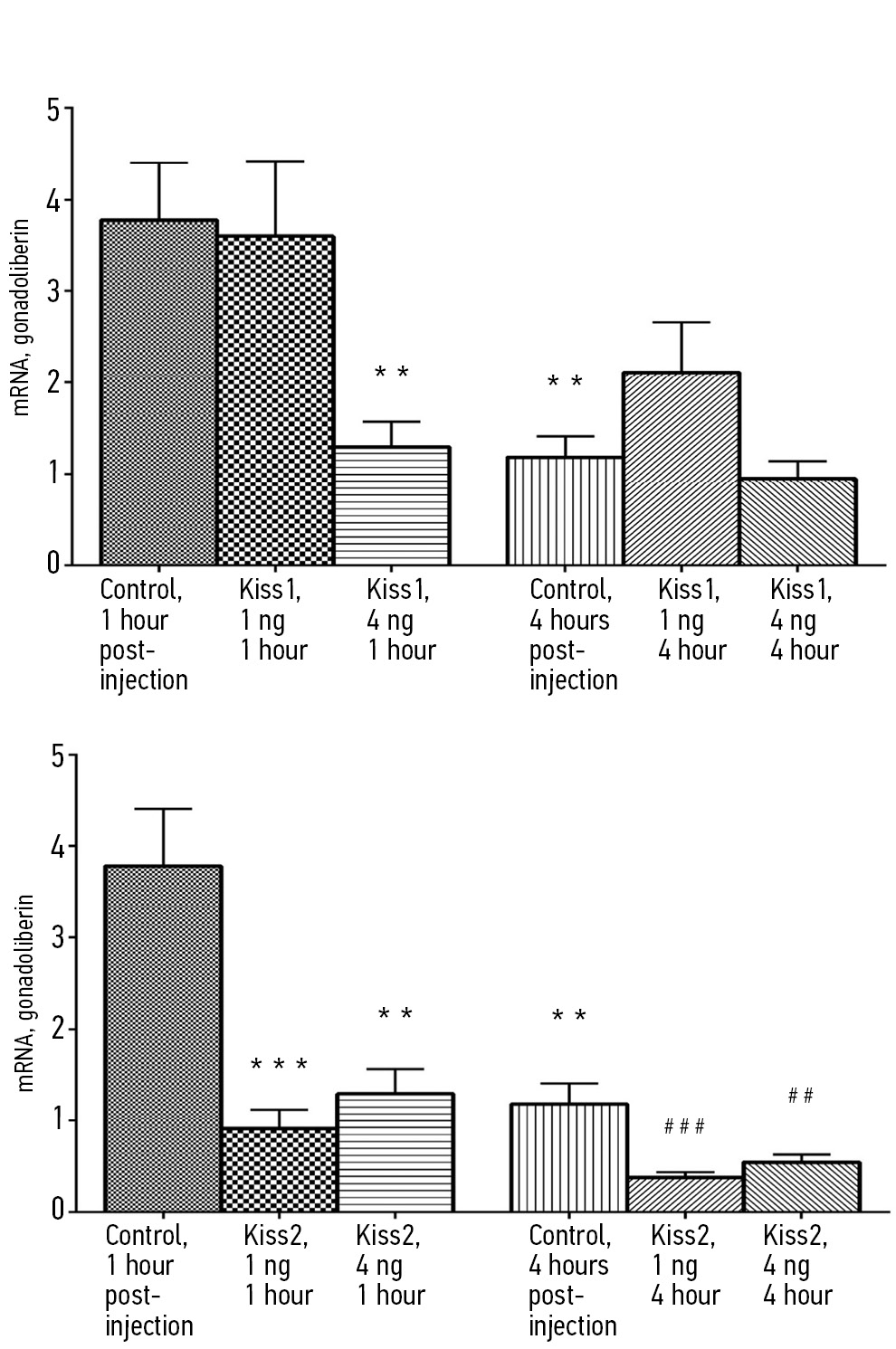 RESULTS: Intracerebroventricular administration of Kiss1 and Kiss2 significantly modulated corticoliberin and gonadoliberin gene expression in the midbrain and diencephalon of Danio rerio. In the group injected with 4 ng of Kiss1, corticoliberin gene expression increased 17- and 65-fold after 4 hours compared to the control groups. In the group administered 1 ng of Kiss2, corticoliberin gene expression increased by 23- and 92-fold compared to the control groups after 1 hour. In the group administered 4 ng of Kiss1, gonadoliberin gene expression decreased threefold compared to the control group euthanized at 1 hour. In the group administered 1 ng of Kiss2, gonadoliberin gene expression decreased fourfold compared to the control group after 1 hour. In the group administered 1 ng of Kiss2, gonadoliberin gene expression decreased threefold compared to the control group after 4 hours.