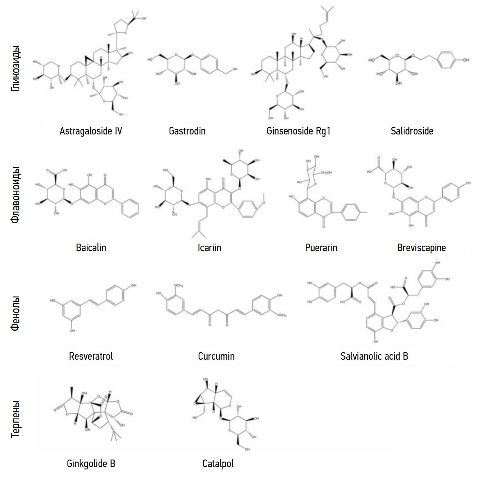 Препараты китайской медицины, особенно традиционный комплекс AGNHW, долгое время использовались для лечения различных заболеваний, включая инфаркт головного мозга [54]. Ранее экспериментальные исследования показали эффективность AGNHW в лечении инфаркта головного мозга с синдромом мокроты-жара и его профилактический потенциал [55]. Клинические исследования показывают, что AGNHW снижает уровень ферритина в сыворотке крови у пациентов с инсультом, что предполагает, что препарат может ингибировать ферроптоз. Было показано, что применение AGNHW уменьшает размер инфаркта, защищает ГЭБ и уменьшает повреждение митохондрий у крыс, перенесших инсульт [54]. Также установлено, что применение AGNHW снижает уровни АФК, ПОЛ и ионов Fe2+, демонстрируя таким образом антиферроптозные эффекты [56, 57].