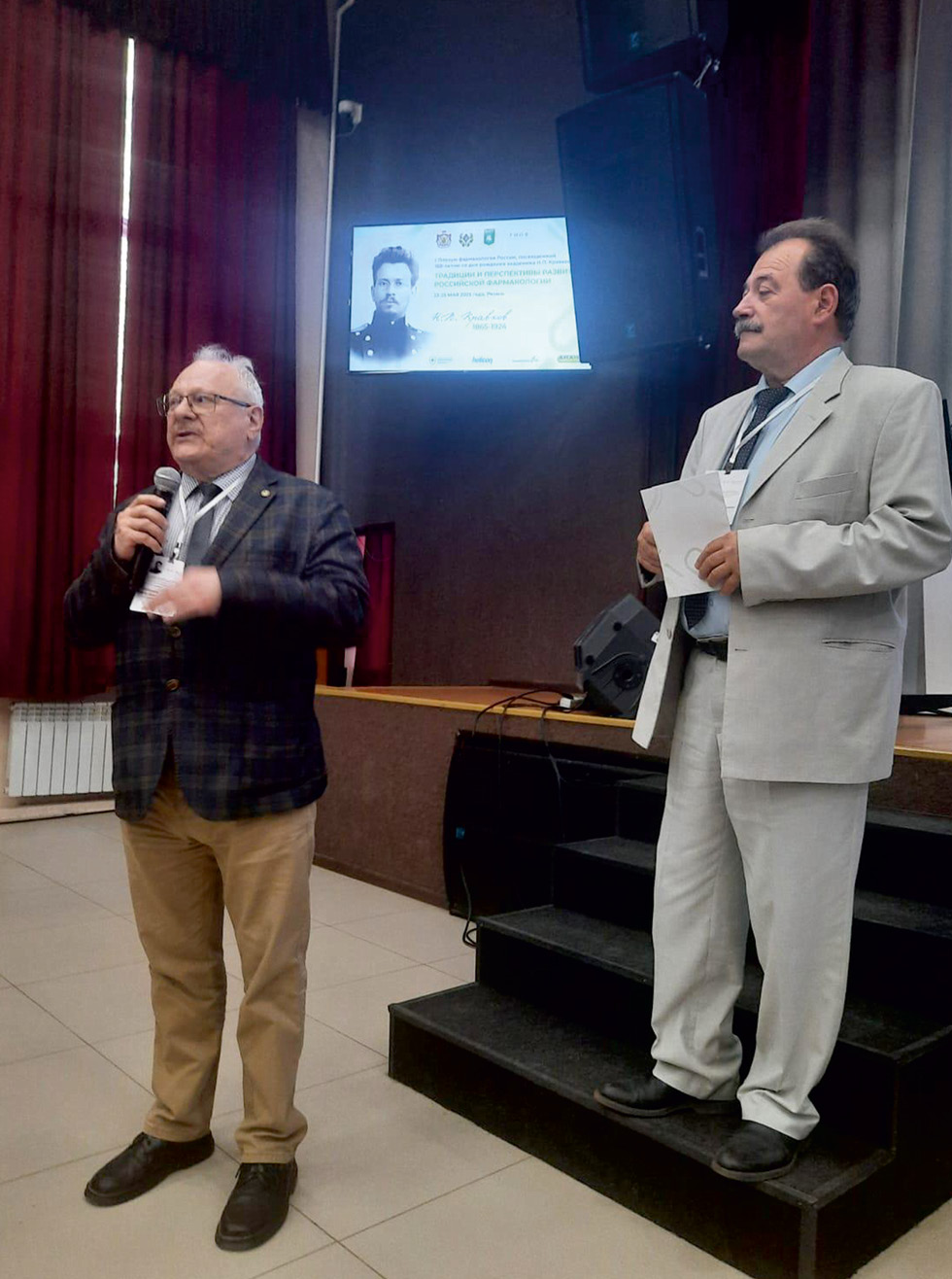 Fig. 5. Speech at the 1st Plenary Session of the Russian Scientific Society of Pharmacologists, Ryazan, May 23, 2025. On the right is Professor M.V. Pokrovsky, the President of the Russian Academy of Sciences (personal archive of the author).