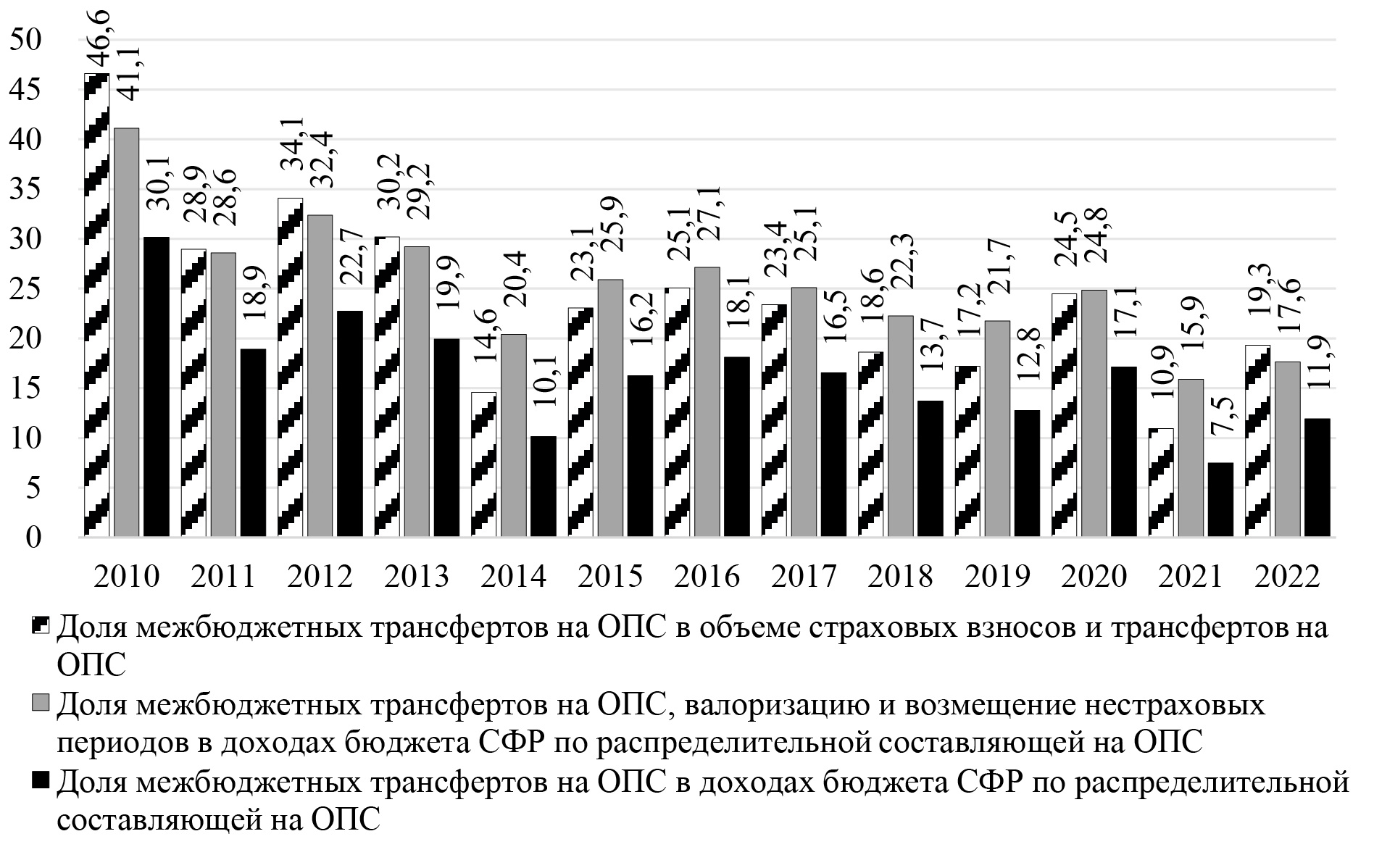 Следует подчеркнуть, что пенсионные права застрахованных лиц указанных льготных категорий плательщиков должны формироваться на общеустановленных нормативных основаниях, которые значительно превышают суммы отчисляемых взносов. Недостающий объем пенсионных прав предусматривается компенсировать за счет перераспределения общеналоговых доходов федерального бюджета в рамках межбюджетных трансфертов. Система межбюджетных трансфертов на ОПС включает компенсацию институционально различных видов пенсионных выплат. В зависимости от текущих изменений структуры этих пенсионных выплат корректируется размер межбюджетных трансфертов. Это приводит к значительным колебаниям доли межбюджетных трансфертов на ОПС в совокупном объеме страховых взносов и трансфертов на ОПС составила 10,9%, а в 2020 г. достигала 24,5%, в 2010 г. – 46,6% (рис. 1).