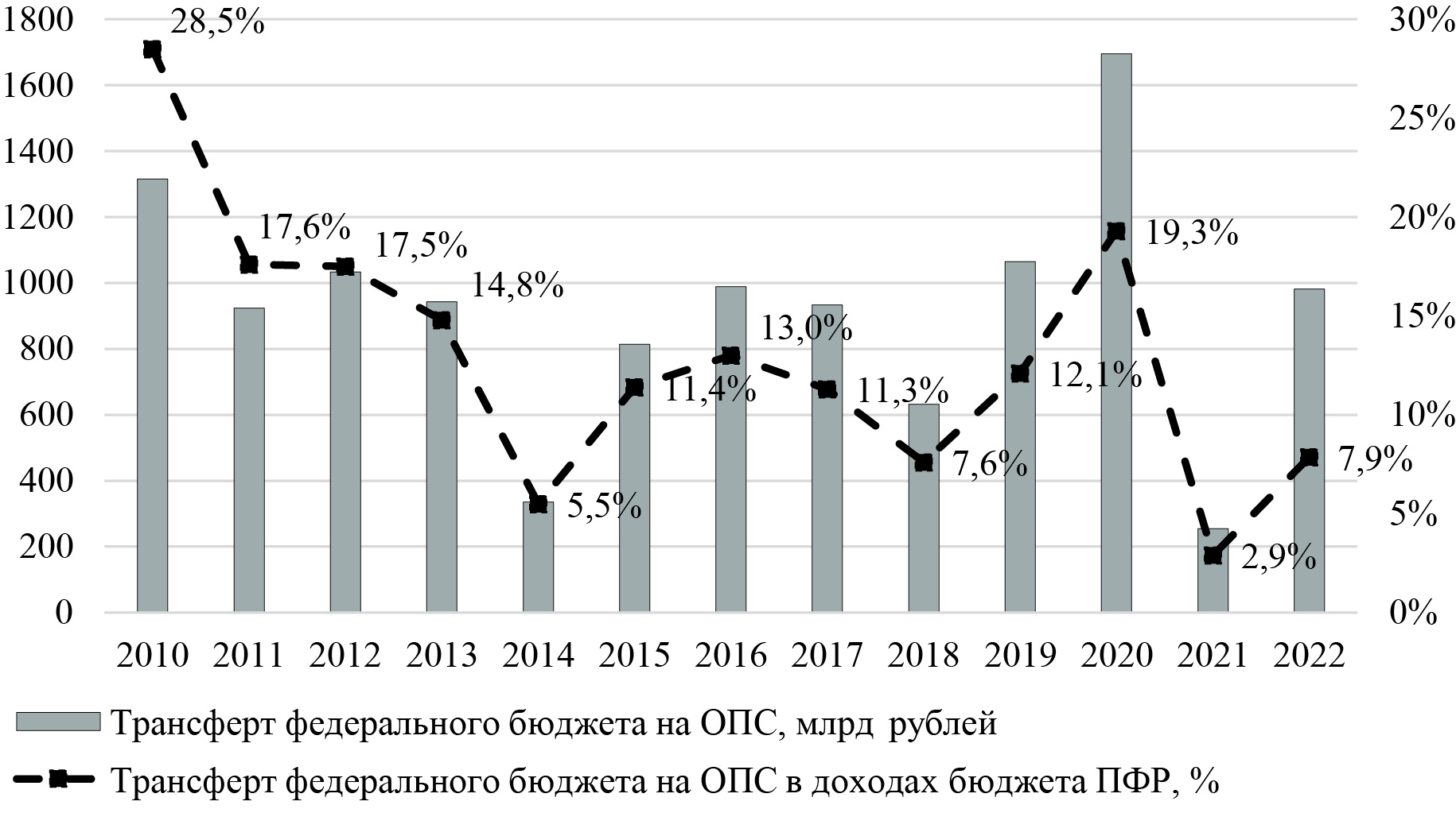 Рис. 1. Динамика доли средств федерального бюджета в доходах на ОПС, %