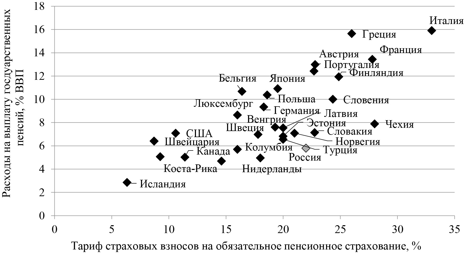 Рис. 4. Сравнение уровня тарифов страховых взносов и расходов на выплату пенсий в странах ОЭСР и России