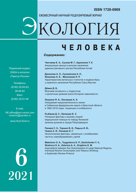 Введение: универсальным источником поступления свинца (Pb) в окружающую среду для регионов независимо от промышленной нагрузки является жидкое и твердое топливо, присутствие Pb в предметах быта также не утрачивает своей актуальности, поэтому определение абсорбции данного микроэлемента различными звеньями биоценоза необходимо проводить не только в мегаполисах, но и средних и малых городах. Цель исследования: выявить уровень аккумуляции Pb в волосах населения административного центра Республики Алтай. Задачи исследования: 1) определить референтные концентрации Pb в волосах жителей Горно-Алтайска с учетом возраста, пола и района проживания; 2) определить долю населения с концентрацией Pb, превышающей биологически допустимый уровень. Методы: У постоянно проживающих в г. Горно-Алтайске практически здоровых людей без хронических заболеваний, на момент обследования без признаков болезни в острой форме, не принимающих витаминно-минеральные комплексы и лекарственные средства, с натуральным состоянием волос и отсутствием вредной привычки табакокурения были собраны образцы волос. Возраст обследованных 4-50 лет: 4-17 лет - 35 человек, 18-21 год - 40, 22-50 лет - 47; проживающих в центральной части города -64 человека, окраинной - 58. Проанализировано 122 образца волос (62 мужских, 60 женских). Концентрацию микроэлементов в растворах с образцами волос определяли атомно-абсорбционным методом («Квант-2», Россия). Значимость различий анализировали с применением критерия Манна - Уитни, связь между переменными - с помощью коэффициента корреляции Спирмена Результаты: Референтное значения концентрации Pb (3,18 мг/кг) в волосах жителей Горно-Алтайска соответствует общероссийским значениям (0,5-3,0 мг/кг). Количество жителей с концентрацией Pb, превышающей биологически допустимый уровень (5,0 мг/кг), составляет 26,2 %. Показатели концентрации Pb в волосах населения коррелируют с их возрастом (r = 0,54) и не зависят от пола (r = -0,007) и района проживания (r = 0,045). У детей и подростков концентрация Pb (1,12 мг/кг) значимо ниже, чем у населения юношеского (3,56 мг/кг) и зрелого возраста (4,38 мг/кг). Выводы: референтные значения концентрации Pb в волосах населения Горно-Алтайска не превышают биологически допустимого уровня, однако значимое увеличение данного показателя с возрастом, а также существенный прирост количества жителей с высокой концентрацией Pb к 22-50 годам свидетельствуют о пролонгированных процессах аккумуляции токсиканта.