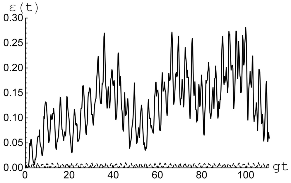 Результаты численного моделирования временной зависимости отрицательности (16) для теплового состояния поля резонатора представлены на рис. 1, 2. Безразмерный параметр керровской нелинейности для кривых, представленных на рисунках, выбран равным В качестве начальных состояний кубитов выбраны состояния: некогерентное состояние (штриховая линия) и когерентное состояние (сплошная линия). Вычисления проведены для случая теплового поля резонатора с (рис. 1) и (рис. 2). Из рисунков хорошо видно, что при наличии керровской нелинейности начальная атомная когерентность приводит к существенному увеличению степени перепутывания кубитов даже для интенсивных тепловых полей резонатора. Таким образом, приготовив кубиты в когерентном начальном состоянии, мы можем добиться существенного увеличения степени их перепутывания.