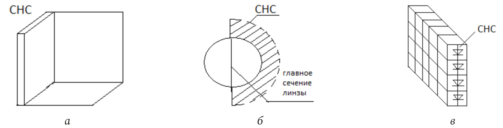 Рис. 2. Варианты совместного использования СНС с уголковым отражателем (а), линзой Люнеберга (б) и волноводной решеткой (в)