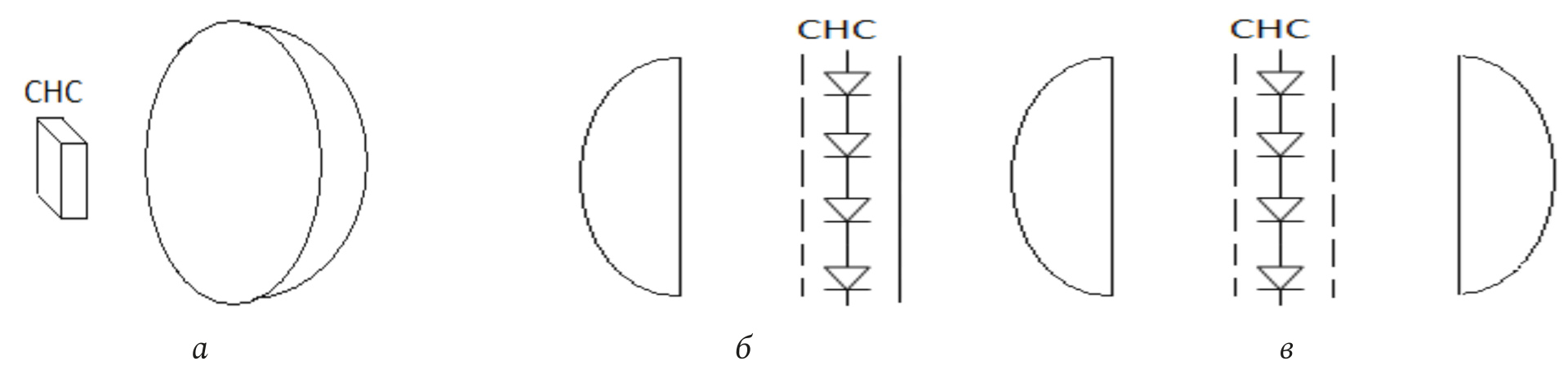 При увеличении периода решетки УС пропорционально уменьшается количество диодов. ДОР становится многолучевой. При противофазном питании диодов в соседних столбцах решетки УС в каждом лепестке ДОР появляется провал (рис. 5). В случае использования параболического зеркала СНС отражательного типа помещается в фокусе (рис. 6, а). Размер фокусного пятна составляет примерно Количество диодов уменьшается до 9 шт. В составе бифокальной линзы СНС отражательного типа включается в фокусе (рис. 6, б). При использовании двух бифокальных линз СНС смешанного типа включается в фокусе между линзами (рис. 6, в). Независимо от конструктивных особенностей и использования типов антенн или отражателей основным (базовым) элементом (узлом) в каждом типе описанных радиотехнических систем является СНС [7–16]. Независимо от выбора структуры СНС основным принципом их построения является определение значений параметров неуправляемых и управляемых слоев, при которых обеспечивается возможность реализации с их помощью предлагаемых способов радиосвязи, основанных на комплексировании функций многих радиотехнических устройств в одном [7–10].