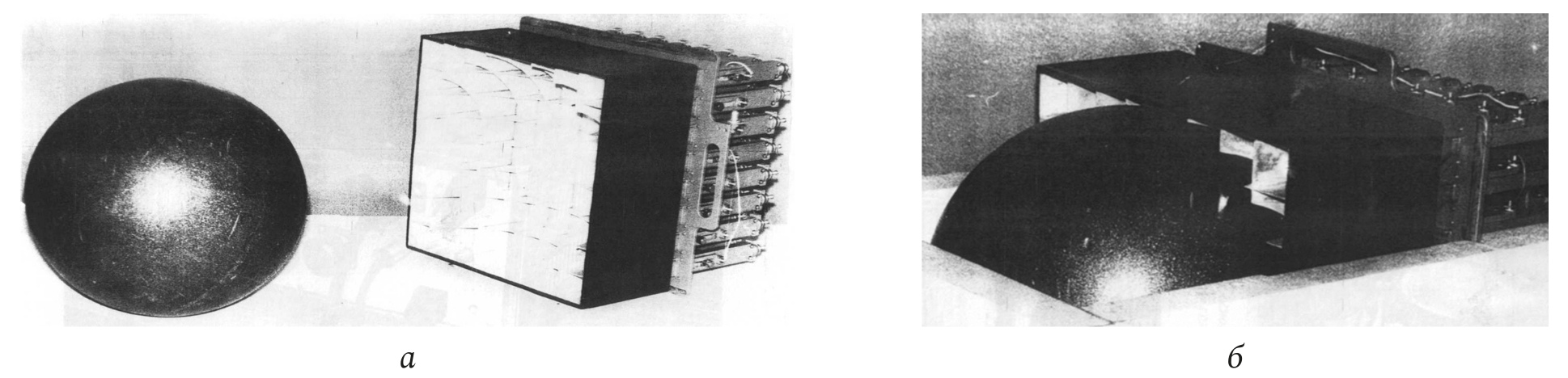 Рис. 8. Макеты КГС в виде волноводно-рупорной решетки с использованием СНС внутри волноводов (а) и с использованием СНС отражательного типа и параболического рефлектора (б)