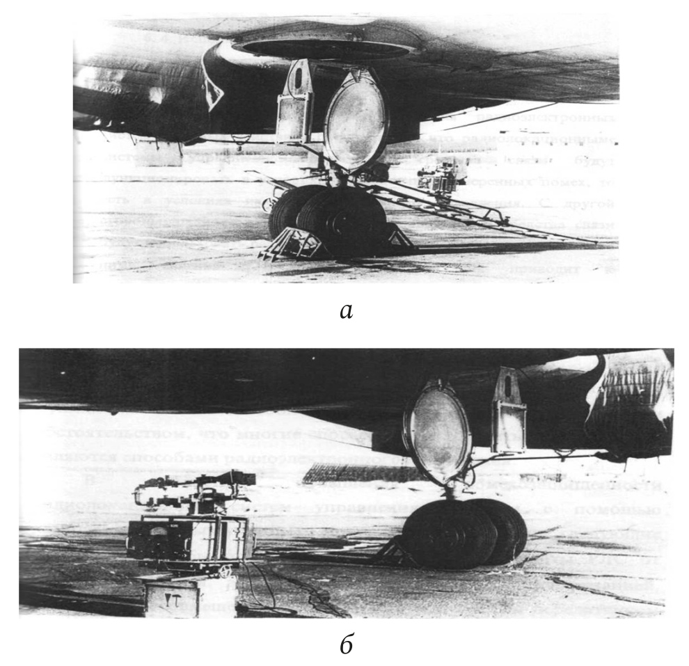 Рис. 10. Макет КГС на основе пассивной СНС отражательного типа и бифокальной линзы на борту самолета Ил-14 (а) и установка для измерения модуля и фазы коэффициента отражения макета управляющего устройства СВЧ на основе пассивной СНС отражательного типа и бифокальной линзы в двух состояниях управляемых элементов под бортом самолета Ил-14 (б)