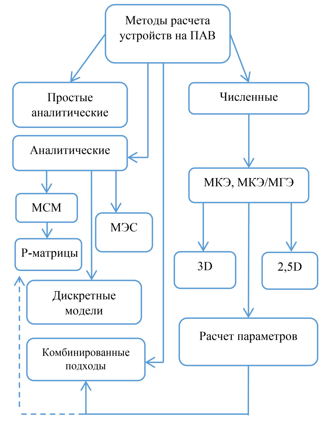 На сегодняшний день уже известны различные методы расчета и моделирования устройств на ПАВ. По условной классификации, предложенной в работе [1], их можно разделить на несколько групп: простейшие аналитические – импульсные модели и подходы на основе дельта-функций [2], более строгие аналитические модели, численные методы и комбинированные подходы. На рис. 1 представлена данная условная классификация.