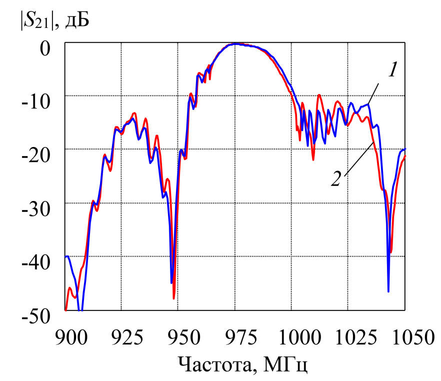 Рис. 9. АЧХ 2-каскадного фильтра DMS: 1 – расчет МСМ, 2 – эксперимент