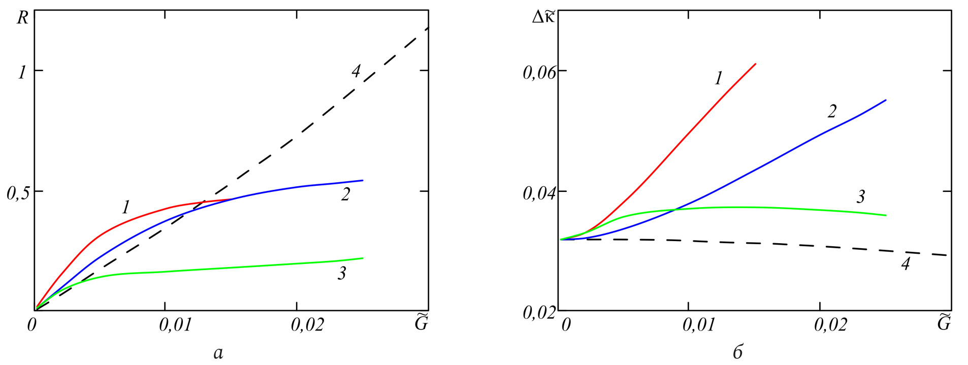 Рис. 2. Графики зависимостей коэффициента отражения (а), полуширины полосы пространственных частот (б) от интенсивности волн накачки при (1), (2, 3), (4)