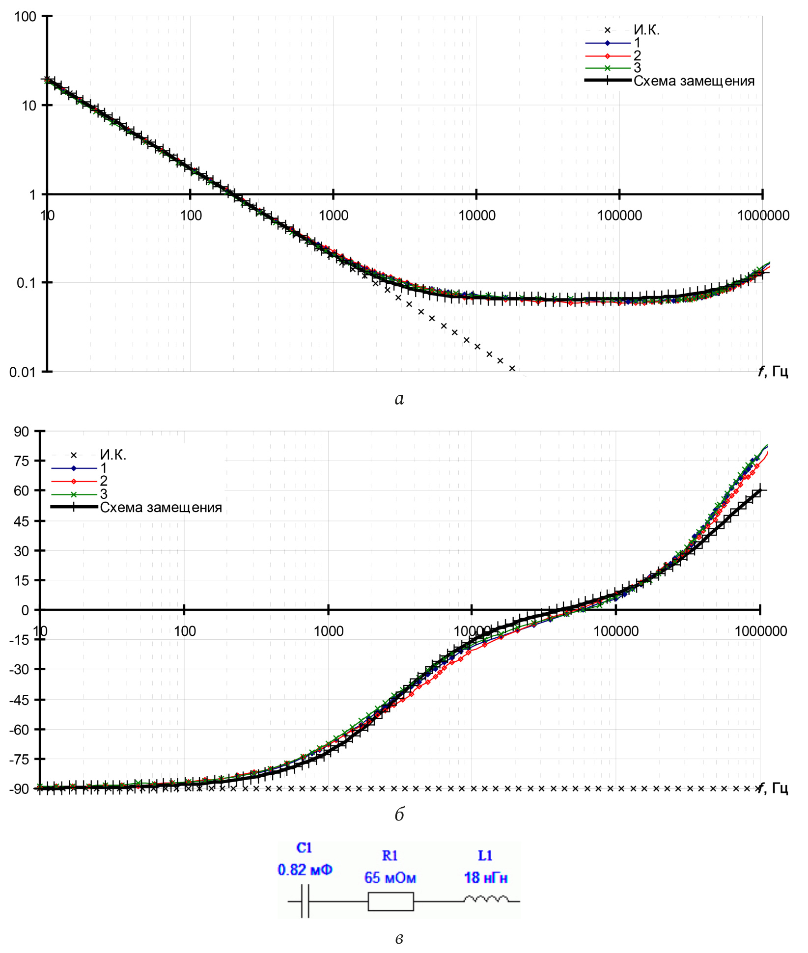Рис. 1. Конденсатор К50-17 820 мкФ × 400 В (алюминиевый оксидно-электролитический): а – модуль полного сопротивления; б – фаза полного сопротивления; в – схема замещения