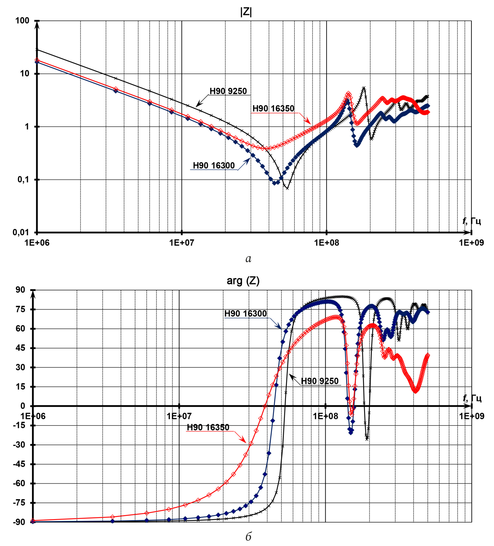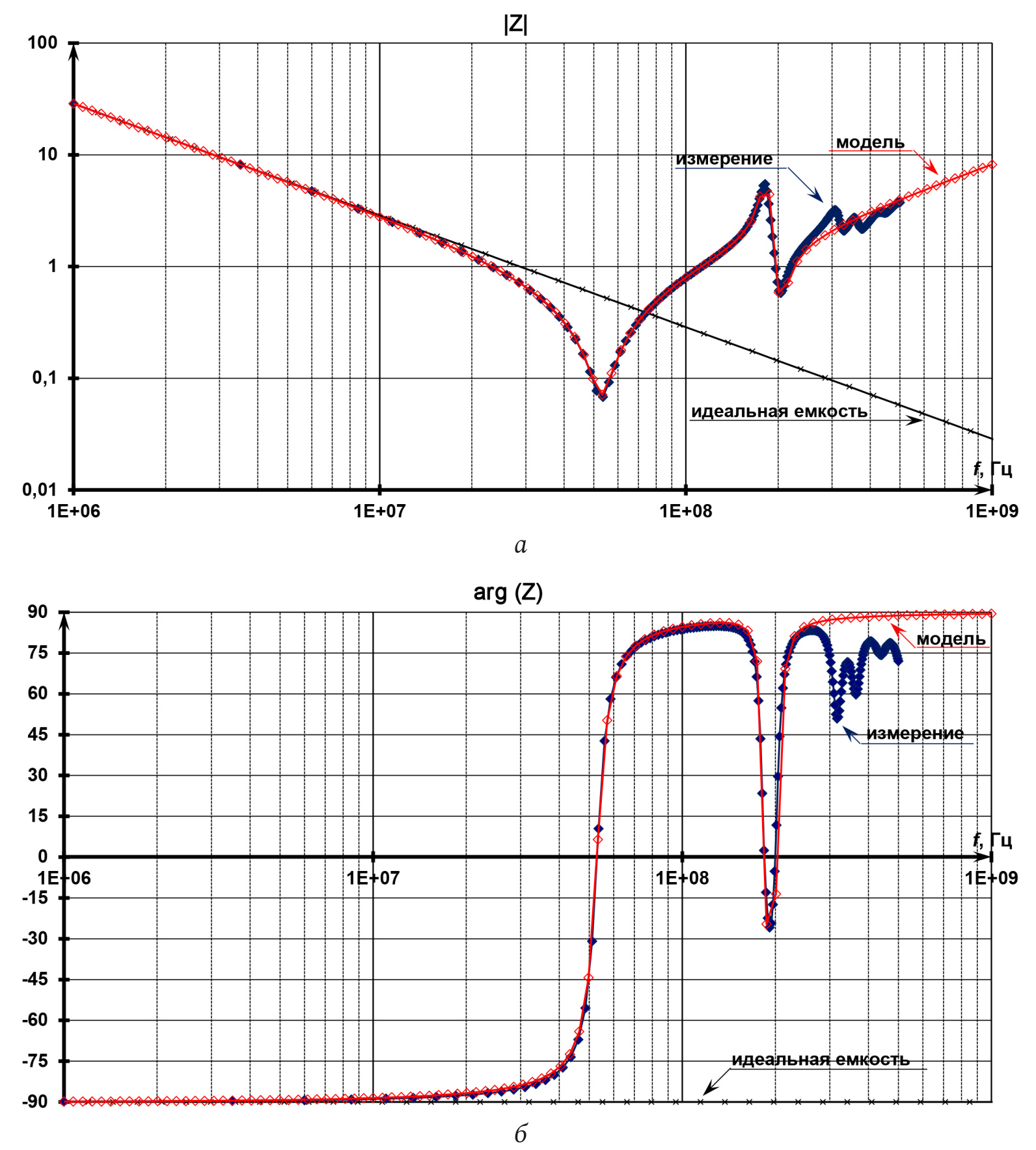 Рис. 7. Модуль (а) и фазы (б) комплексного сопротивления диэлектрика: измеренное значение в сравнении с рассчитанным по схеме замещения (рис. 6)