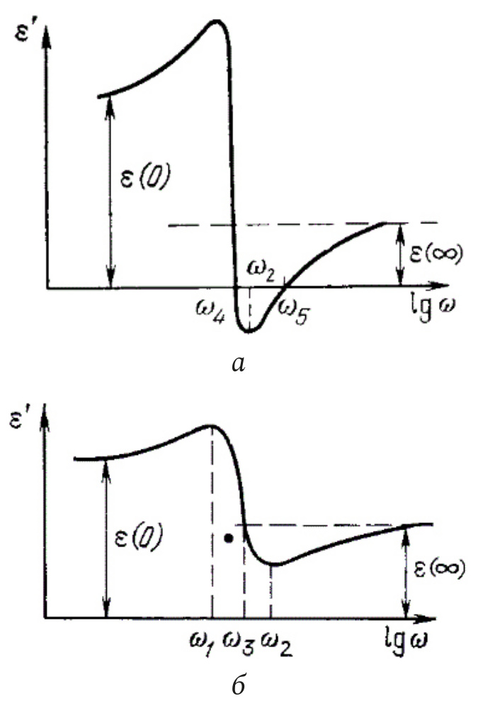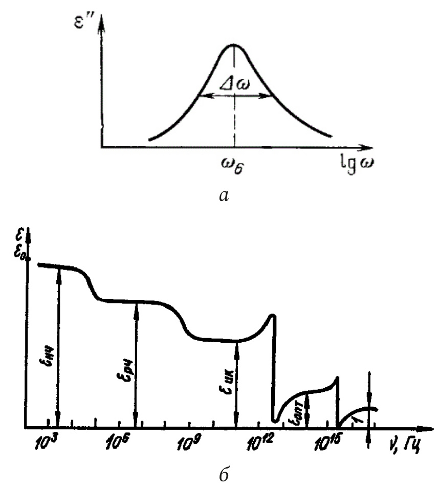 Рис. 11. Теоретическая частотная зависимость ε, характеризующая диэлектрические вкладов различных механизмов поляризации и их запаздывание (взято из [12])
