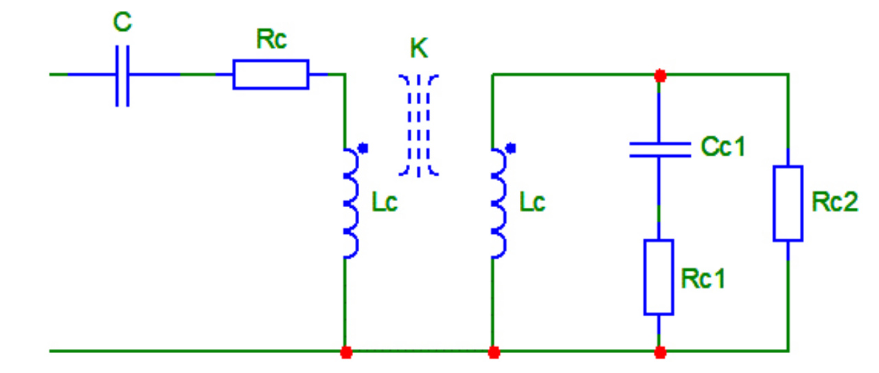 В полученной схеме замещения (рис. 13) элементы CC1, RC1 и RC2 определяют ВЧ-резонанс (частоту и добротность резонанса), а коэффициент связи K определяет частоту ВЧ-антирезонанса (рис. 14).