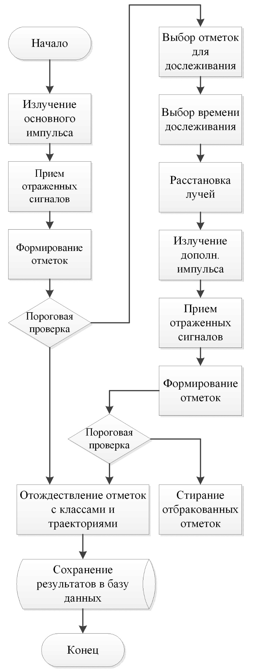 В соответствии с предложенным алгоритмом к существующей системе управления АР предъявляются требования к дополнительной установке передающего и приемных лучей на основе пороговой обработки. В соответствии со структурой на рис. 1 пороговая обработка может быть также совмещена с разделением объектов на классы и формированием траекторий, т. е. после реализации вторичной обработки сигналов. Это означает, что на рис. 2 предложен наиболее простой алгоритм обнаружения малозаметных целей, отвечающий структуре системы управления АР на рис. 1.