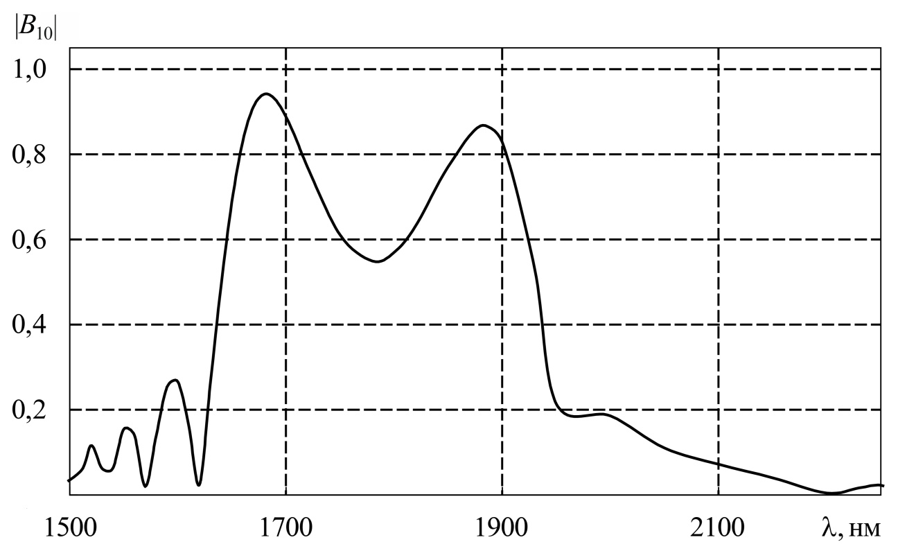На рис. 5–7 приведен спектр пропускания каскадной решетки, спектральная зависимость модуля коэффициента возбуждения волны и спектральная зависимость модуля коэффициента возбуждения волны соответственно при следующих параметрах: период решетки составил мкм, длина обеих ДПВР по см, расстояние между решетками (длина вставки одномодового волокна) составила см. Радиус сердцевины 1,455 мкм, а оболочки – 62,5 мкм. Количество учитываемых волн бралось равным 10.