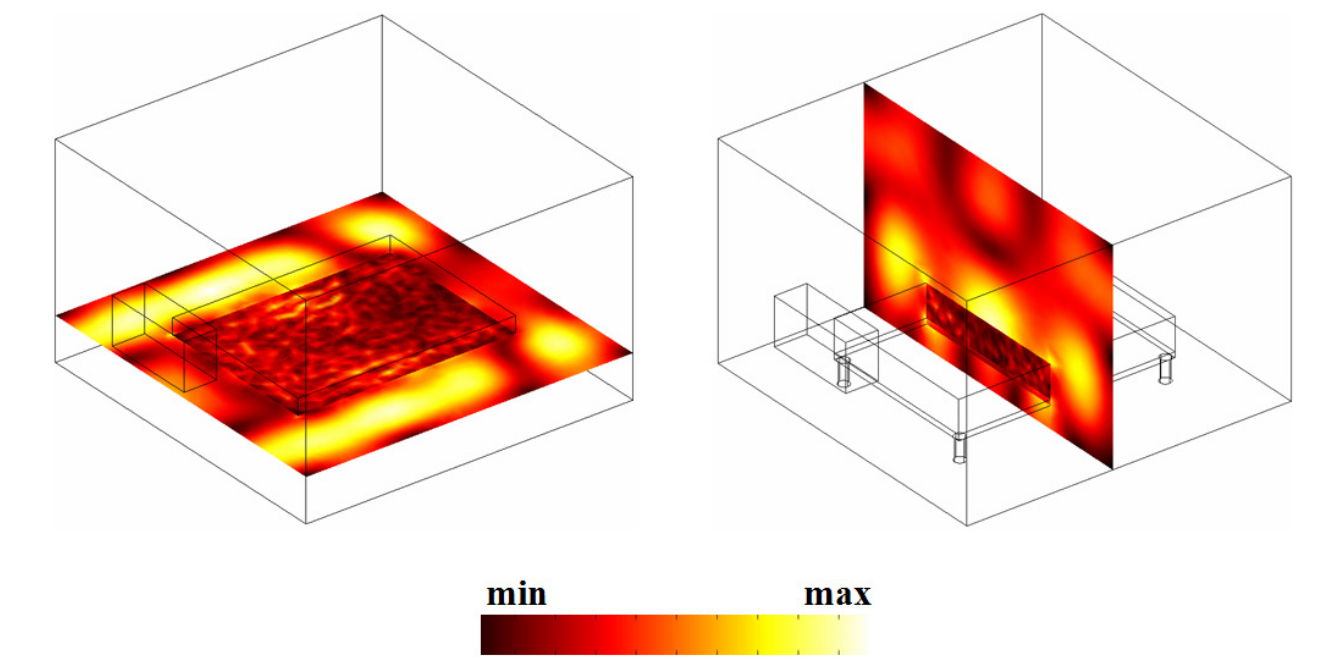 Численная полноволновая модель была дополнена функциональными зависимостями (9) и (10) для термопараметрической среды, и были найдены распределения ЭМ-поля в объеме стерилизатора. На рис. 3 показана структура электрического поля в резонаторе на рабочей частоте стерилизатора для температуры иммерсионной среды 95 °С. Далее были установлены значения коэффициента отражения и коэффициента поглощения (А), причем