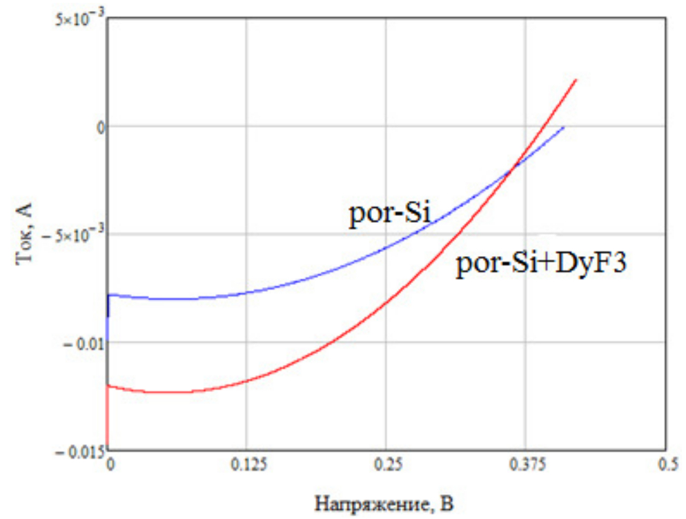 На рис. 1 представлены ВАХ четырех структур: на подложке кремния, не подвергшегося травлению (Si), Si с нанесенным слоем просветляющего покрытия из фторида диспрозия (Si + DyF3), пористого кремния, полученного путем травления той же подложки (por-Si), и этого por-Si с нанесенной пленкой фторида диспрозия (por-Si + DyF3).