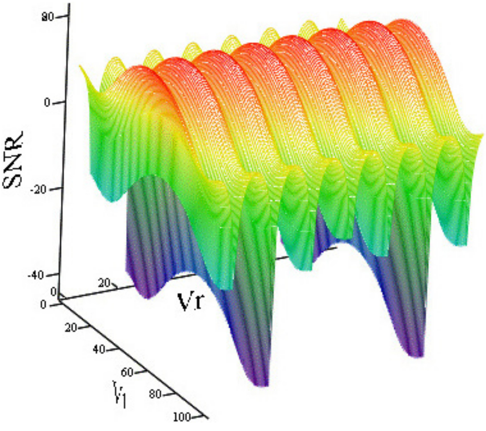 Как видно из рис. 1, отношение сигнал – шум в поле скоростей воздушной цели неоднородно, особенно глубокие провалы наблюдаются по оси радиальной скорости, что, соответственно, приводит к снижениям вероятности правильного обнаружения.