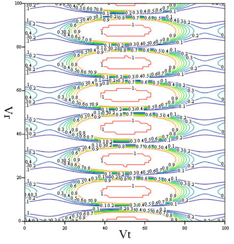 Рис. 3. в зависимости от [м/с], [м/с] (на изображении индекс по осям меняется от 1 до 100), при наблюдении цели с ЭПР м2, базе интерферометра 2 м, пространственное разрешение 6 м на динамичном фоне с удельной ЭПР минус 10 дБ