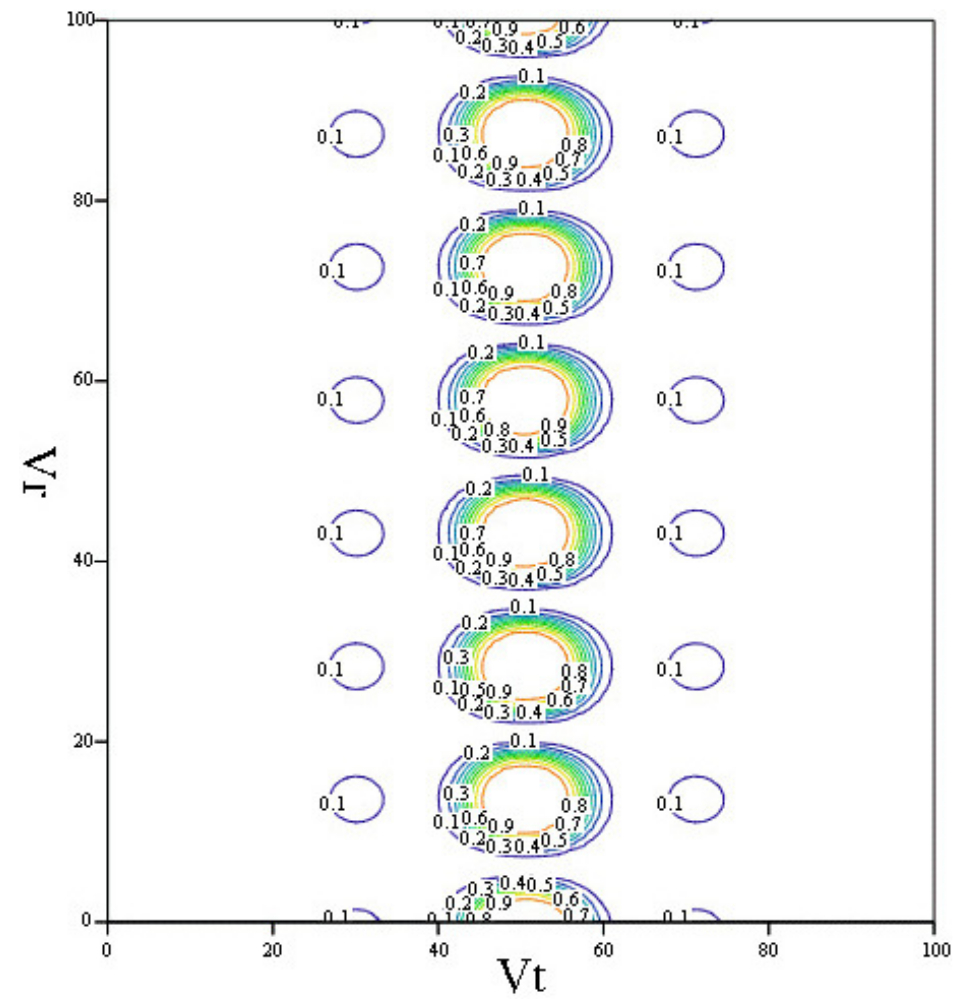 Fig. 4. depending on [m/s], [m/s] (in the image, the index along the axes changes from 1 to 100), when observing a target with EPR m2, the base of the interferometer is 2 m, the spatial resolution is 6 m for the case of simultaneous reception on 2 bases
