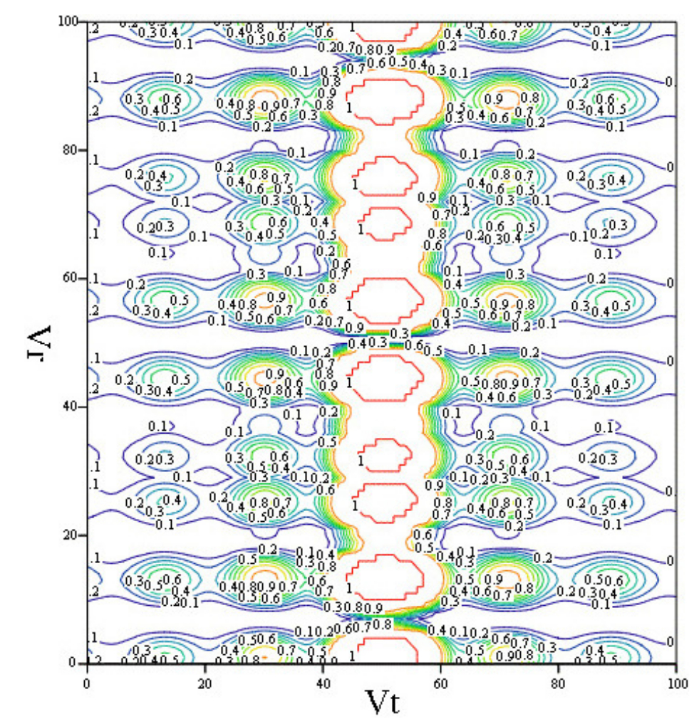 Fig. 5. depending on [m/s], [m/s] (in the image, the index along the axes changes from 1 to 100), when observing a target with EPR m2, the base of the interferometer is 2 m, the spatial resolution is 6 m for the case of simultaneous reception on 2 bases and using the auto focus mode of mobile targets