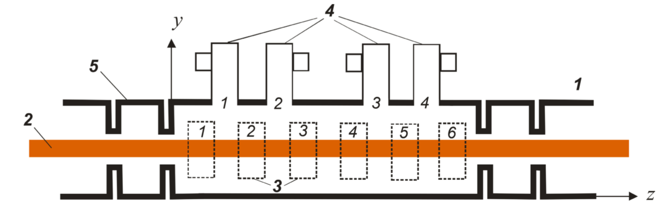 Рис. 1. Схематический вид конвейерной камеры СВЧ-нагрева: 1 – отрезок волновода с продуктом; 2, 3 – окна ввода энергии через боковые стенки (номера окон: 1, 2, 3, 4, 5, 6); 4 – устройства ввода энергии через верхнюю стенку (КВП) (1, 2, 3, 4 – окна связи на верхней стенке)