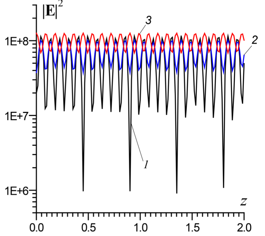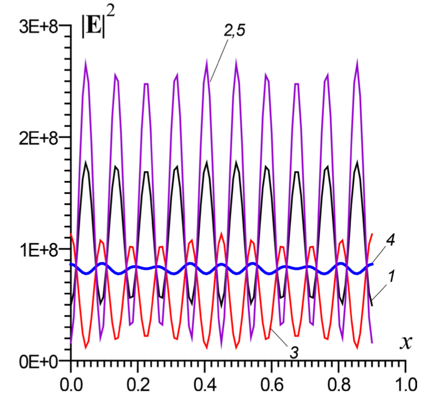 Результаты моделирования приводят к следующим выводам. При движении транспортера вдоль оси z каждая точка продукта проходит через локальные минимумы и максимумы (рис. 2), при этом среднее (усредненное) поле почти не меняется, что обеспечивает в среднем однородный нагрев. При некоторых координатах z вдоль оси x реализуется достаточно однородное распределение выделяемой мощности, а неравномерность нагрева на других линиях x компенсируется за счет движения, поскольку каждая точка проходит области минимумов и максимумов (рис. 3). В целом движение для распределения поля (рис. 4) обеспечивает достаточно равномерный нагрев. Реально температура при близко расположенных чередующихся многочисленных локальных минимумах и максимумах выравнивается за счет теплопроводности. Следует учесть разброс (нестабильность) порядка 1 % частот генерации магнетронов и случайность их фаз, что приводит к перестройке во времени распределений поля. Улучшить равномерность нагрева можно, механически меняя граничные условия, например вводя вентилятор с металлическими лопастями, улучшающий также конвекцию и вывод влажного воздуха.