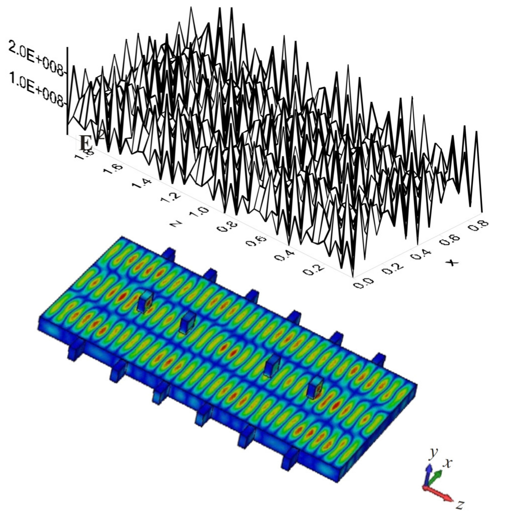 На рис. 2‒4 приведены результаты расчета квадрата поля |E|2 в плоскости от x и z в камере длиной 2 м, шириной 0,9 м и высотой 0,1 м с продуктом толщины 3 см и при 6 окнах ввода энергии на каждой из боковых стенок и 4 окнах ввода сверху для линейной частоты 2,45 ГГц. Вводимая мощность через каждое окно полагалась равной 500 Вт, т. е. полная мощность равнялась 8 кВт. Результат сходится для трех итераций. В приведенном расчете использовано 11 вариаций по каждой из осей, т. е. более 1000 мод, что привело ко времени счета порядка нескольких секунд на персональном компьютере малой производительности. Моды высоких порядков вносят малый вклад, поэтому в расчетах можно в несколько раз снизить число используемых мод и существенно понизить время счета при сохранении порядка точности. Поле симметрично относительно плоскостей и На рис. 4 также приведены результаты моделирования той же структуры в CST Microwave Studio с заданием портов в глубине отрезков волноводов. Как видно, имеют место хорошее совпадение и относительно равномерный нагрев. Также имеет место хорошее соответствие распределения в сечениях для рис. 2 и 3. Моделирование в CST занимает примерно час времени на компьютере высокой производительности. Предложенный метод удобен тем, что позволяет легко оптимизировать конструкцию, изменяя положение окон, поскольку не требует большого времени счета.