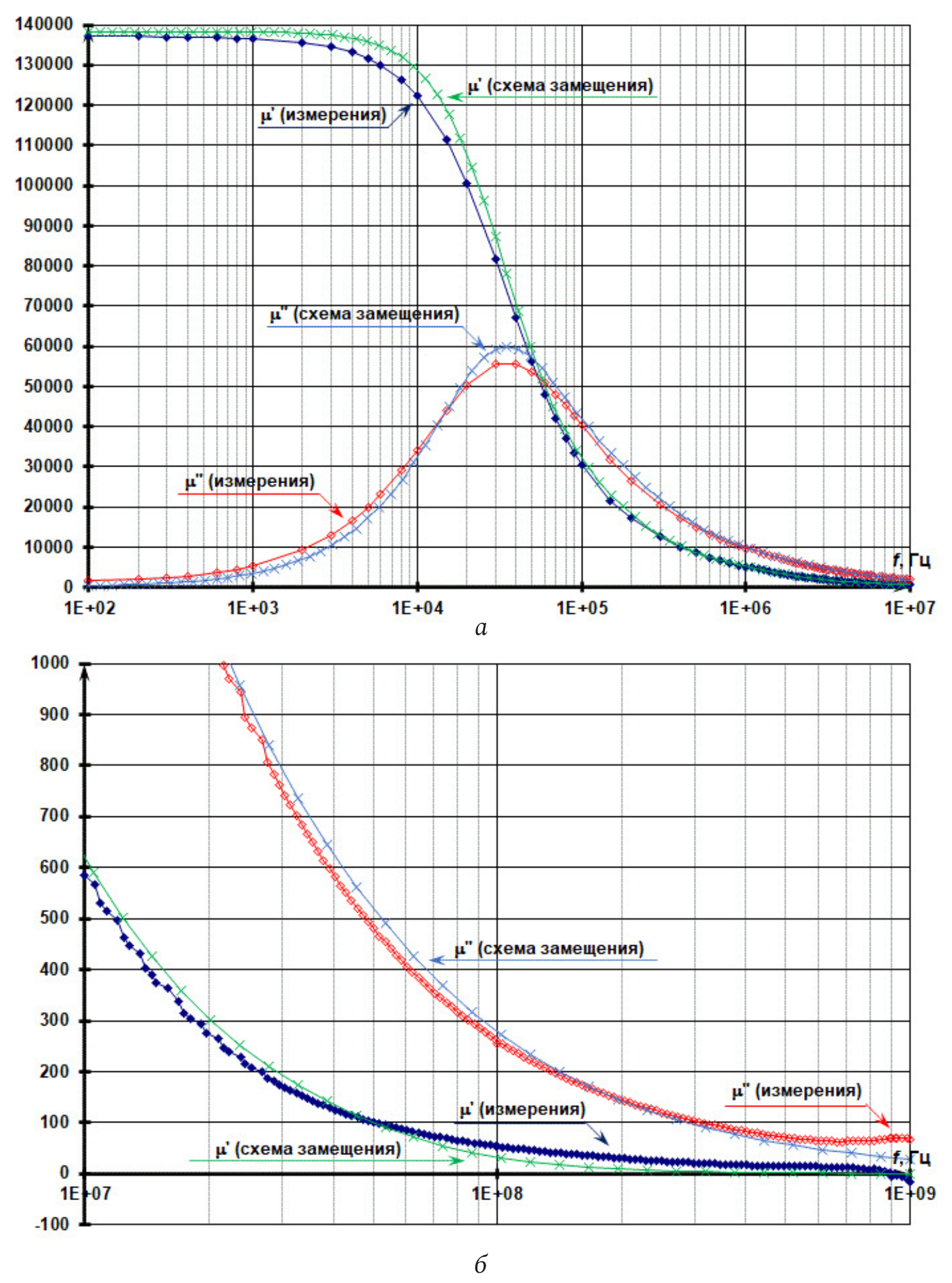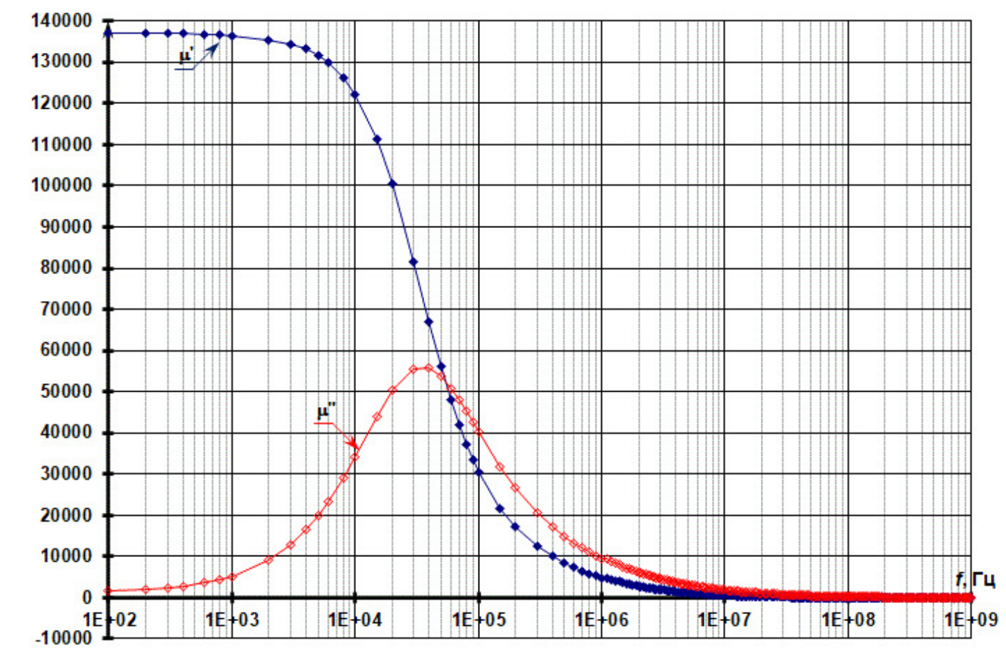 Для данного сердечника (MSFN-25S-TH) по измеренному сопротивлению одновиткового дросселя (рис. 2, кривая 1) была определена комплексная проницаемость материала сердечника (рис. 5)
