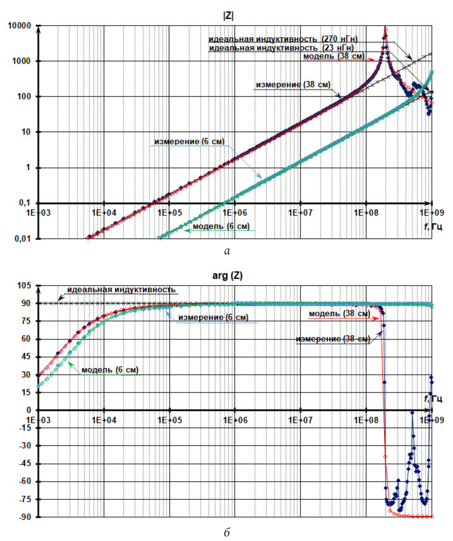 Рис. 8. Модуль (а) и фазы (б) комплексного сопротивления провода (∅ = 1,5 мм) разной длины (6 см и 38 см): измеренное значение в сравнении со схемой замещения