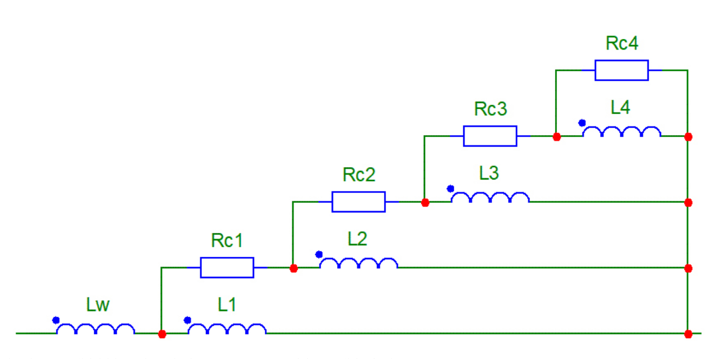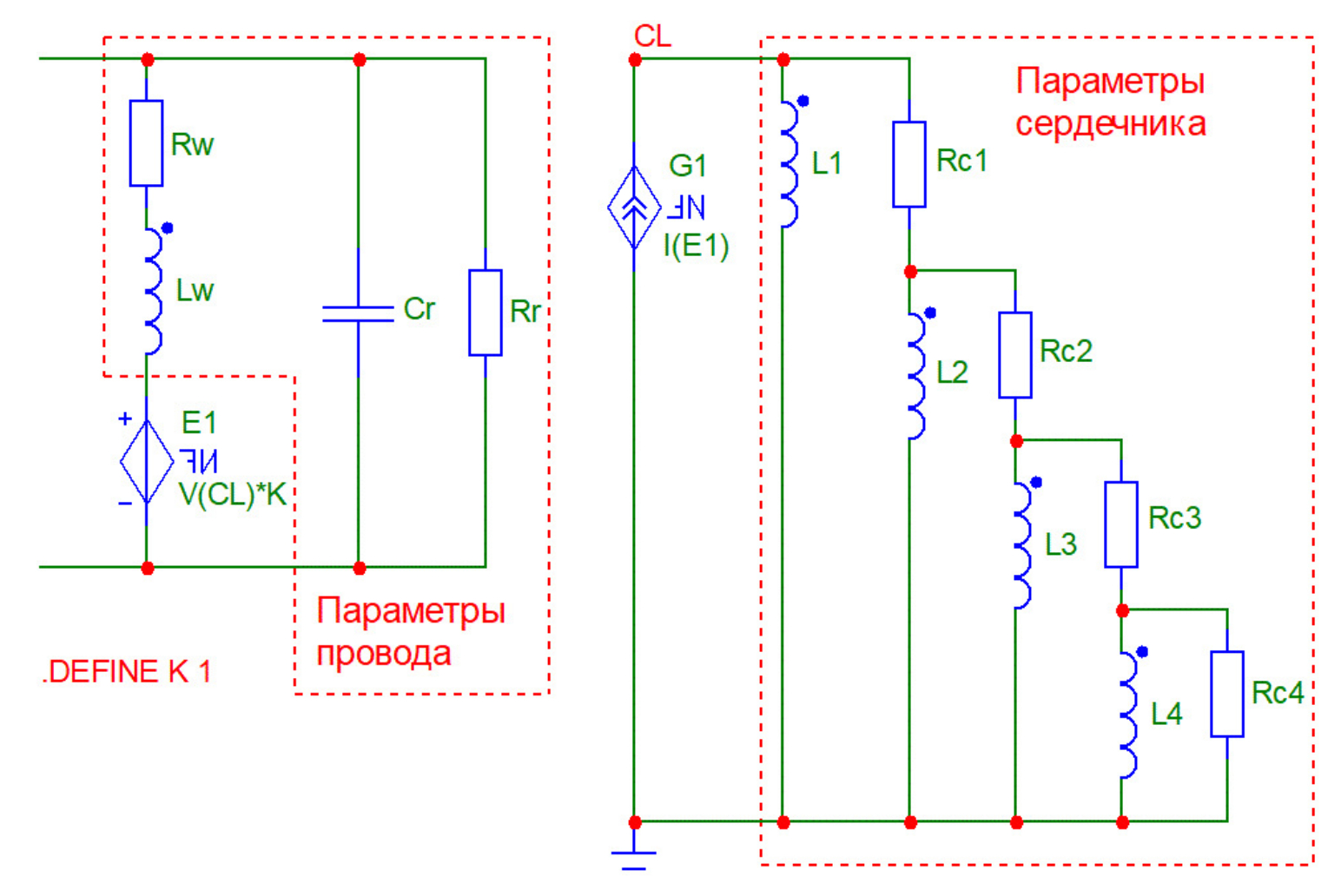Преимущество такого разделения схемы замещения дросселя на влияние провода и сердечника заключается в том, что на основании этой схемы замещения дросселя можно небольшими изменениями сделать схему замещения двух- или трехобмоточного дросселя, а также трансформатора. Для этого необходимо в схему замещения дросселя (рис. 16) добавить еще параметры провода каждой новой обмотки, скорректировать коэффициенты в зависимых источниках и добавить влияние индуктивности рассеивания.