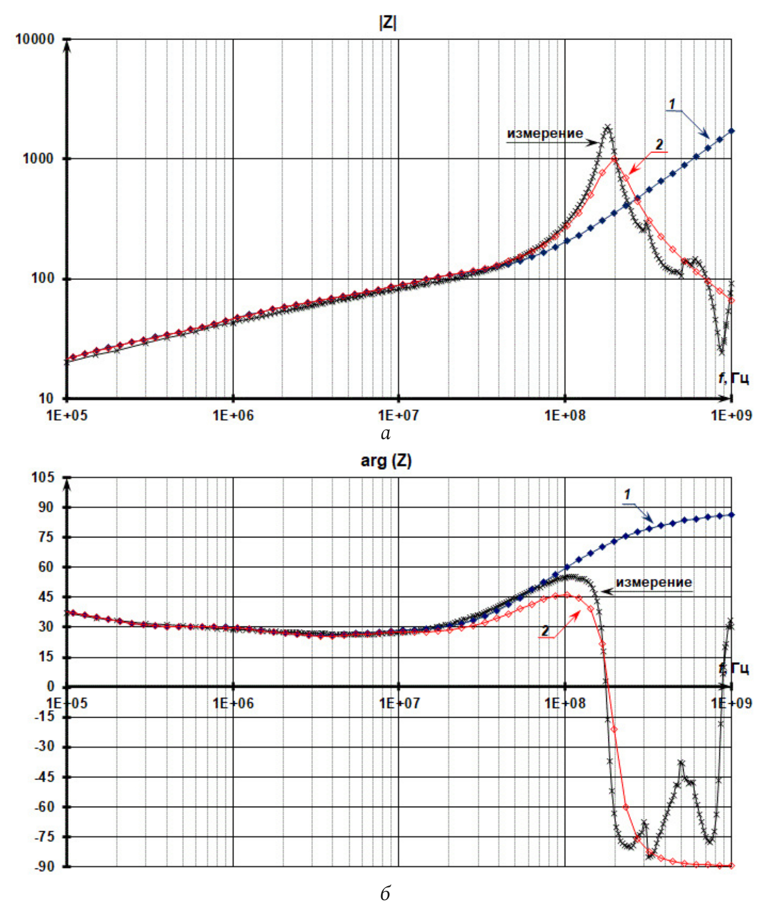 Рис. 13. Модуль (а) и фазы (б) комплексного сопротивления дросселя: измеренное значение в сравнении с различными схемами замещения провода: 1) с учетом только индуктивности провода, 2) с учетом всех параметров провода