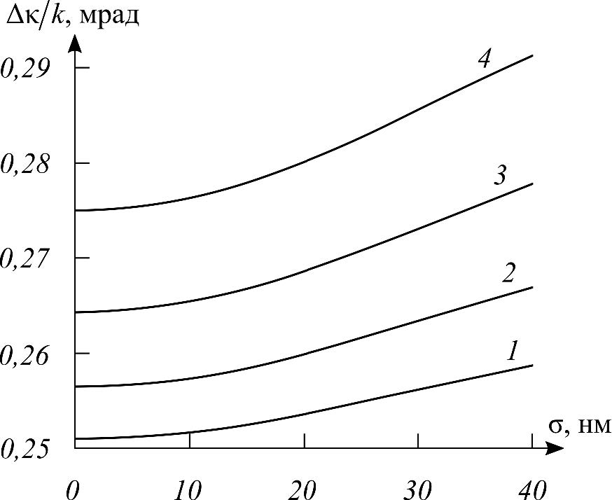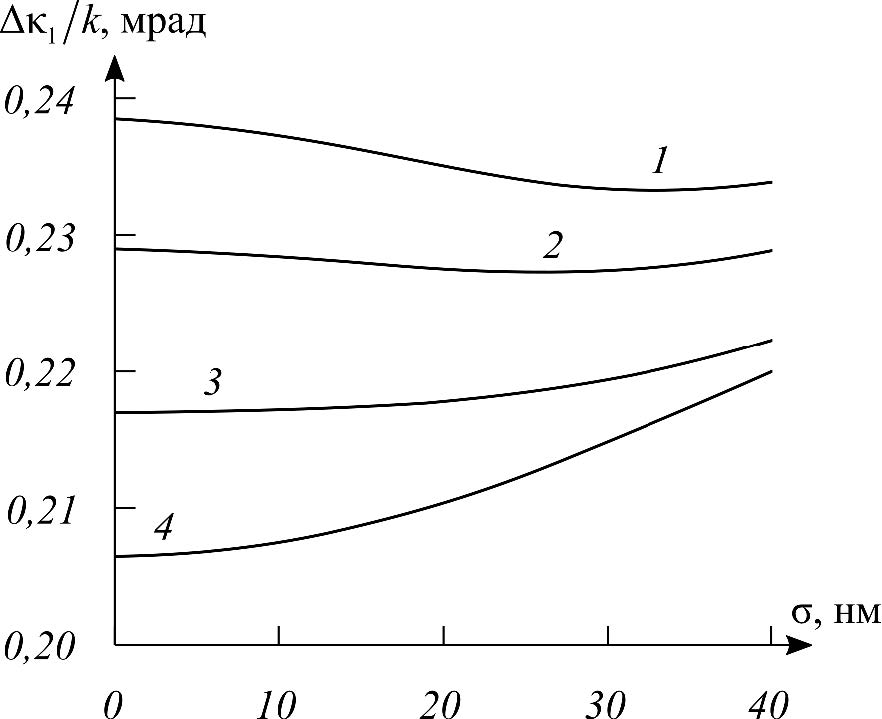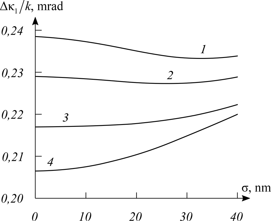 Fig. 4. Graph of the dependence of the cut “ring” width on the standard deviation at mm, (1), 148 (2), 156 (3), 190 nm (4)