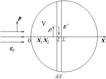 where X is the coordinate of propagation of the incident wave; p is the unit vector in the plane of oscillation of vector E0 perpendicular to the direction of wave propagation, i.e., wave vector k; A0 is the wave amplitude; and kX is the wave phase. Volume V is in the region X > 0, and plane X = 0 is the left boundary of this volume.