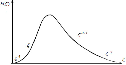 Fig. 2. Spectrum of turbulence. Dependence of the turbulence energy on the wave number of turbulent pulsations
