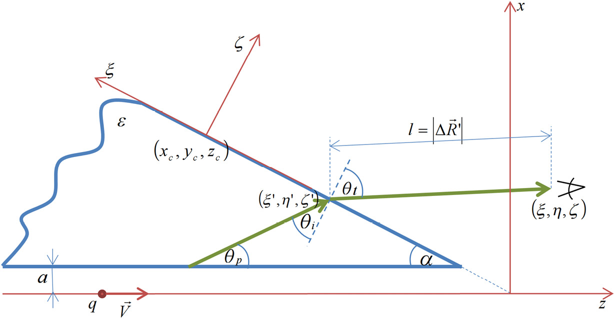 Let us consider the advantages of the geometric–optical method using the following problem as an example. A particle with charge q and speed (where c is the speed of light) at a distance a from its lower boundary travels along the boundary of a dielectric prism with dielectric permeability ε and magnetic permeability . The size of the prism is considered large compared to the wavelength under consideration. The prism is located in a medium in which differences from vacuum are unsubstantial (Fig. 1). We assume that radiation is emitted only from a rectangular region centered at a point with sides d and b parallel to the axes and respectively; accordingly, the remainder of the prism is closed to radiation.