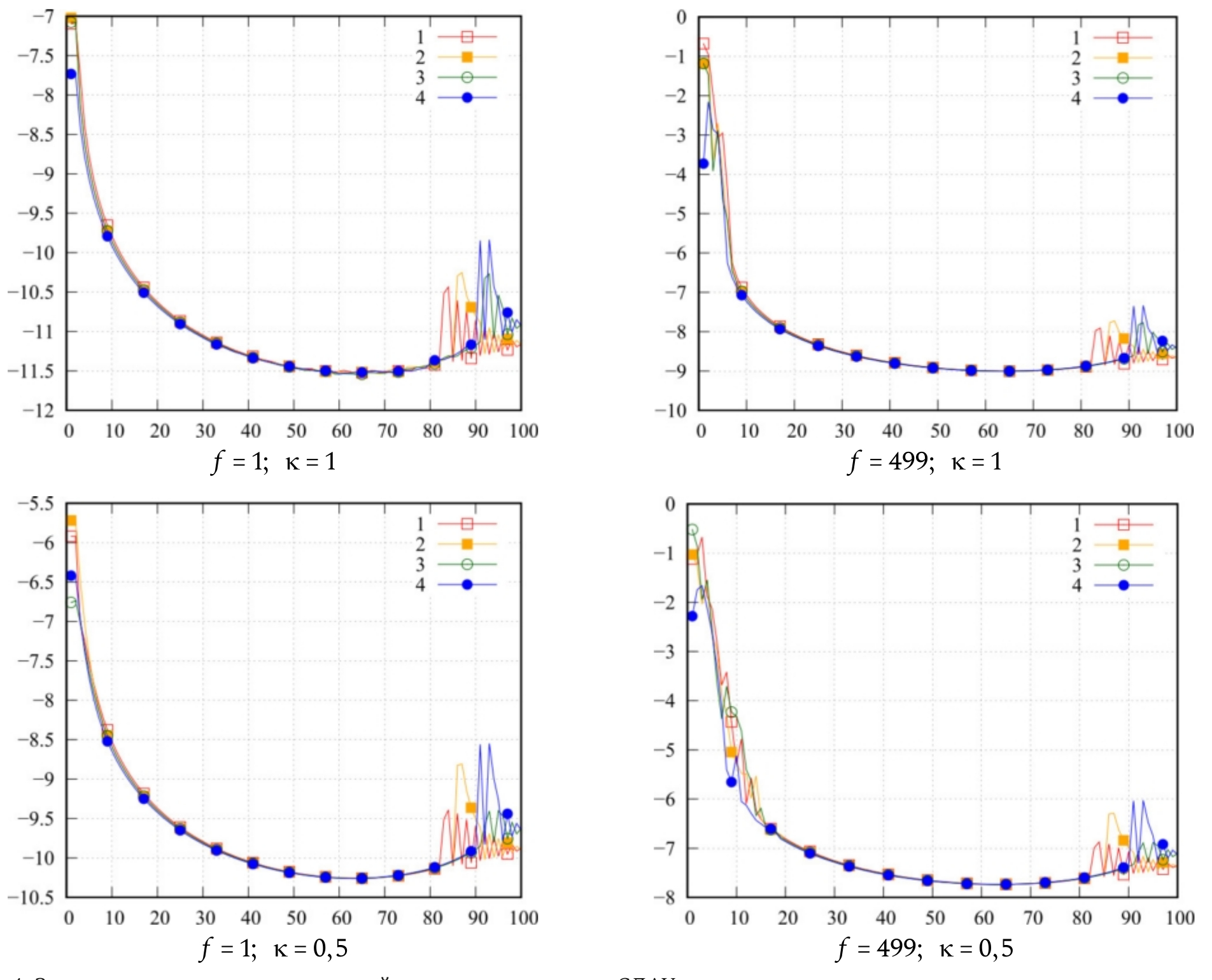На рис. 4 приведены графики значений детализирующие невязку по для различных номеров СВ в угловых точках области . Вдоль оси абсцисс отложен номер СВ. Из представленных графиков видно, что наибольший вклад в ранее рассмотренные значения невязки вносят СВ с небольшими значениями номеров n, что является хорошим ориентиром при построении аппроксимаций СВ в области .