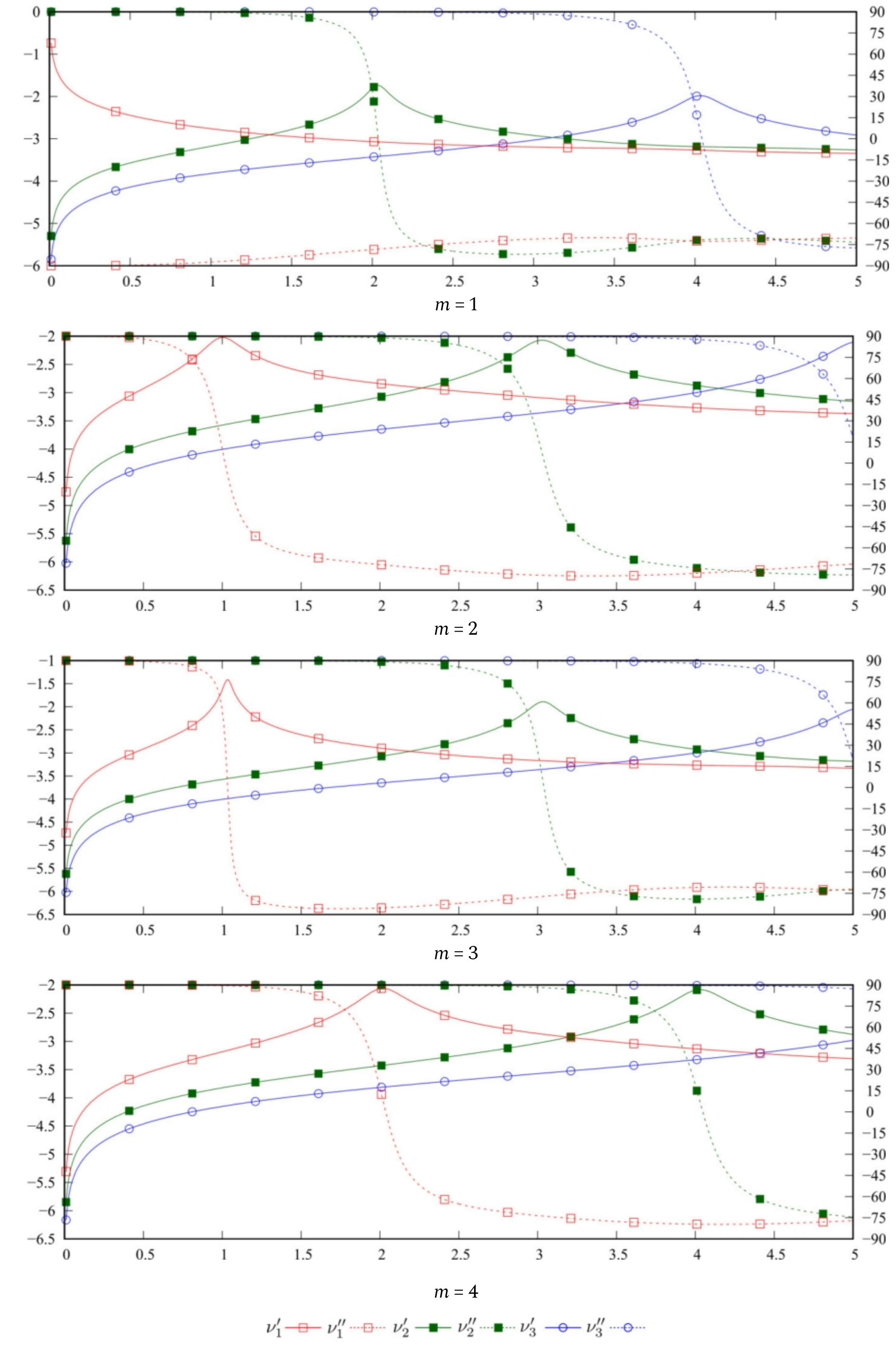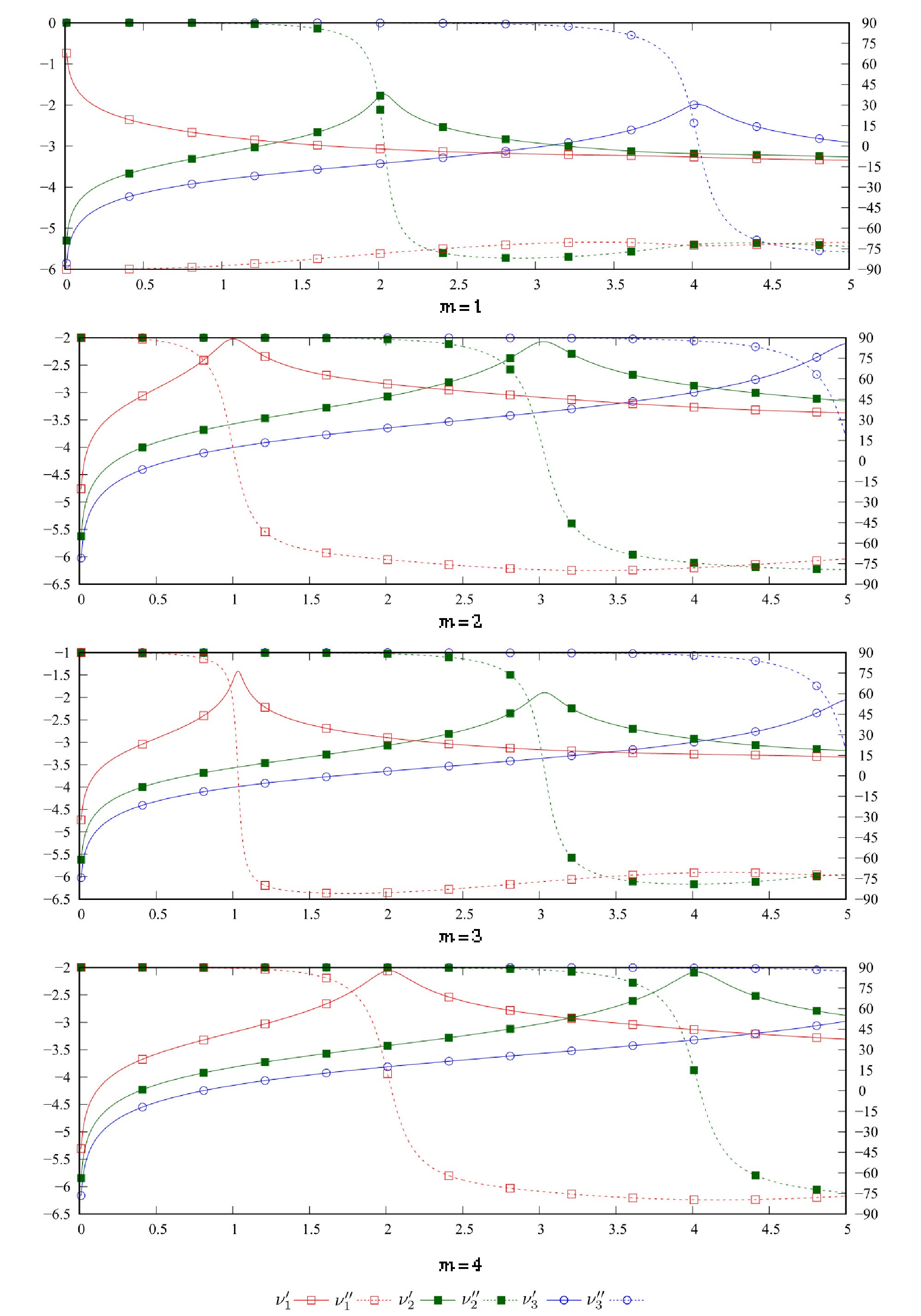 Соотношение интенсивностей действительной и мнимой части собственных функций позволяет оценить величина графики которой приведены на рис. 6. Во всех случаях наблюдается общая тенденция: при малых значениях интенсивность мнимой части собственных функций мала, поэтому колебания точки СФ происходят практически синфазно. С ростом интенсивность действительной и мнимой части становятся соизмеримыми, что ведет к нарушению синфазности колебаний. Также при больших значениях есть точки, в которых интенсивность мнимой части СФ в десятки раз превышает интенсивность действительной части.