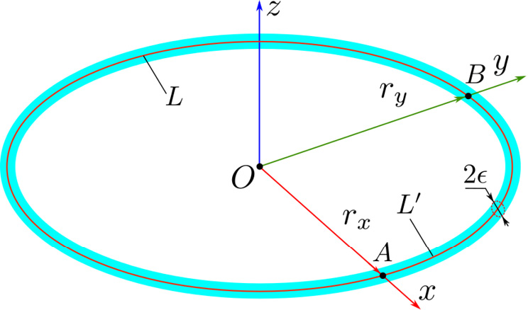 Рассмотрим решение внутренней задачи электродинамики на эллиптической рамочной структуре (ЭР) методом собственных функций. Геометрия структуры показана на рис. 1. Проводник ЭР, обладающий бесконечно большой проводимостью, имеет круглое сечение диаметра которое много меньше длины волны и полной длины образующей проводника. Таким образом, для ЭР целесообразно использовать тонкопроволочное приближение, в рамках которого объемная плотность тока сводится к азимутально независимому полному току, протекающему по образующей проводника. Символ далее будет использоваться также и для обозначения образующей.