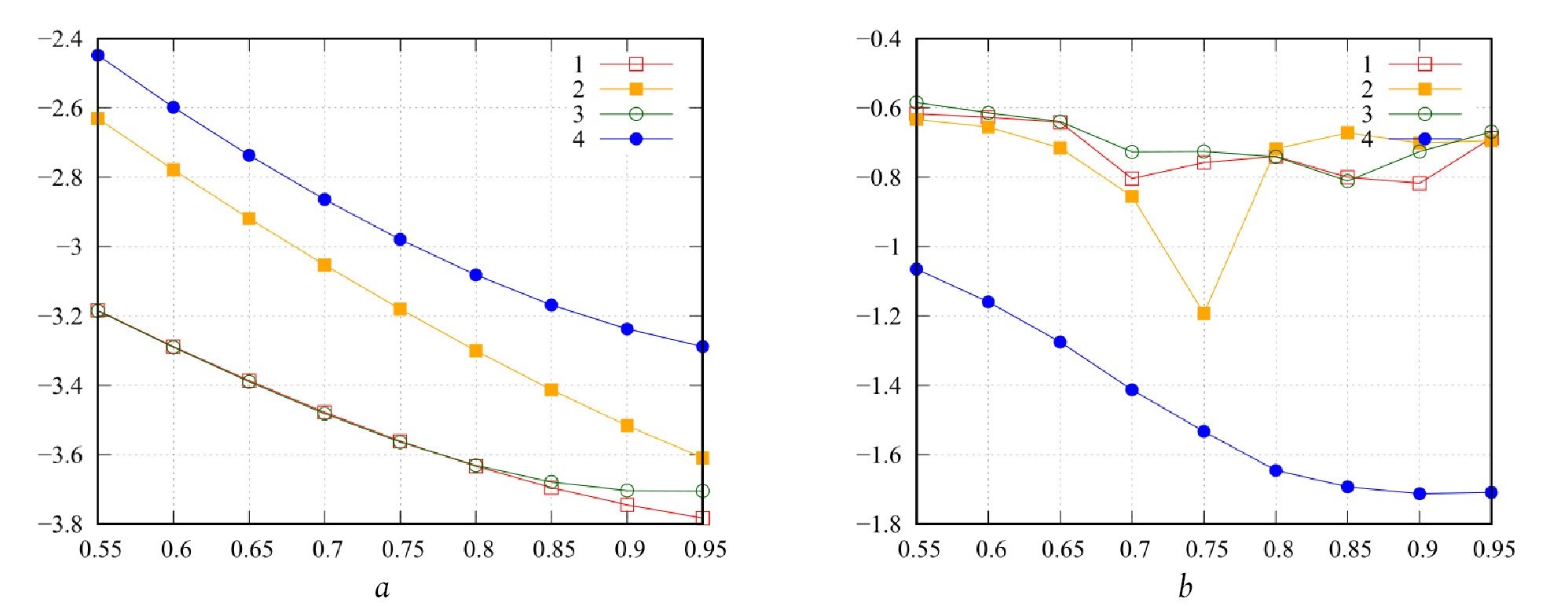 Рис. 3. Зависимость от : а – ; б – , номер кривой соответствует номеру СЛАУ