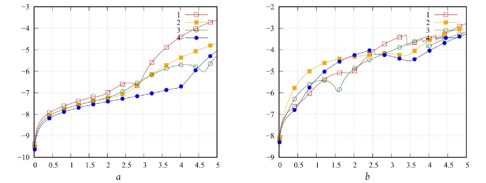 Fig. 2. Dependence on ; a – ; b – , the number of the curve corresponds to the number of SLE