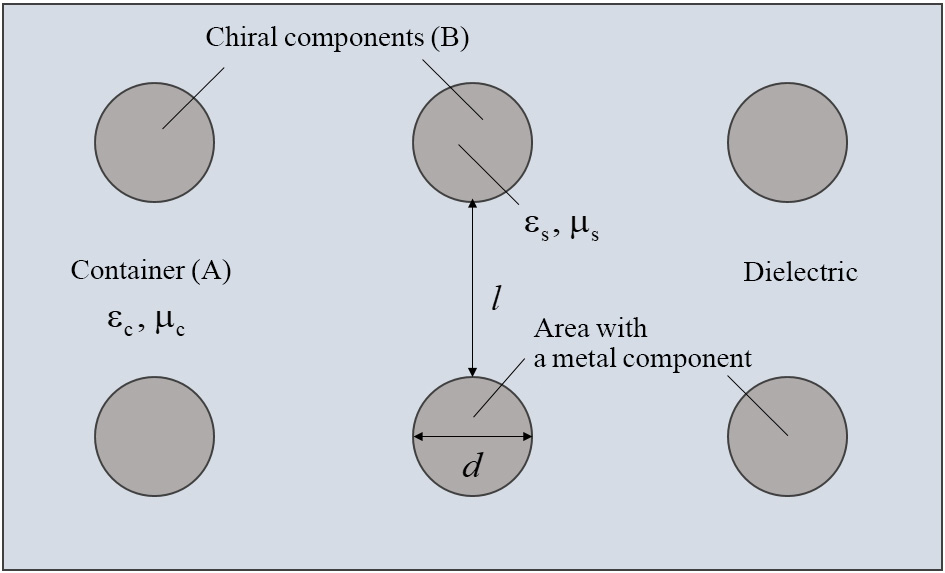 Let us consider the generalized structure of the arbitrary metamaterial shown in Fig. 1. The CMM consists of a dielectric container (A) with relative permeabilities εc and μc where chiral metal inclusions (B) are placed. The areas comprising mirror-like asymmetric elements have relative permeabilities εs and μs. The linear dimension of the areas is d, and the distance between adjacent elements is l.