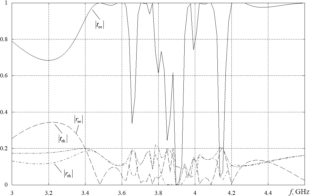 Fig. 4 shows the frequency dependence of the moduli of the reflection coefficients of the main (ree denoted by the dotted line) and cross-polarized (reh denoted by the dash-dash-dotted line) components and the transmission coefficients of the main (tee denoted by the solid line) and cross-polarized (teh denoted by the dash-dotted line) components of ametamaterial based on C-shaped elements with specified geometric dimensions.