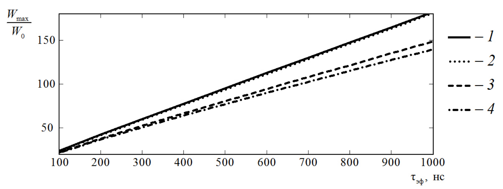 Рис. 4. Зависимости предельно допустимой энергии длинных СВЧ-импульсов от эффективной длительности огибающей: 1 – оптимальная огибающая; 2 – прямоугольная огибающая; 3 – гауссова огибающая; 4 – треугольная огибающая / Fig. 4. Dependences of the maximum allowable energy of long microwave pulses on the effective duration of the envelope: 1 – optimal envelope; 2 – rectangular envelope; 3 – Gaussian envelope; 4 – triangular envelope