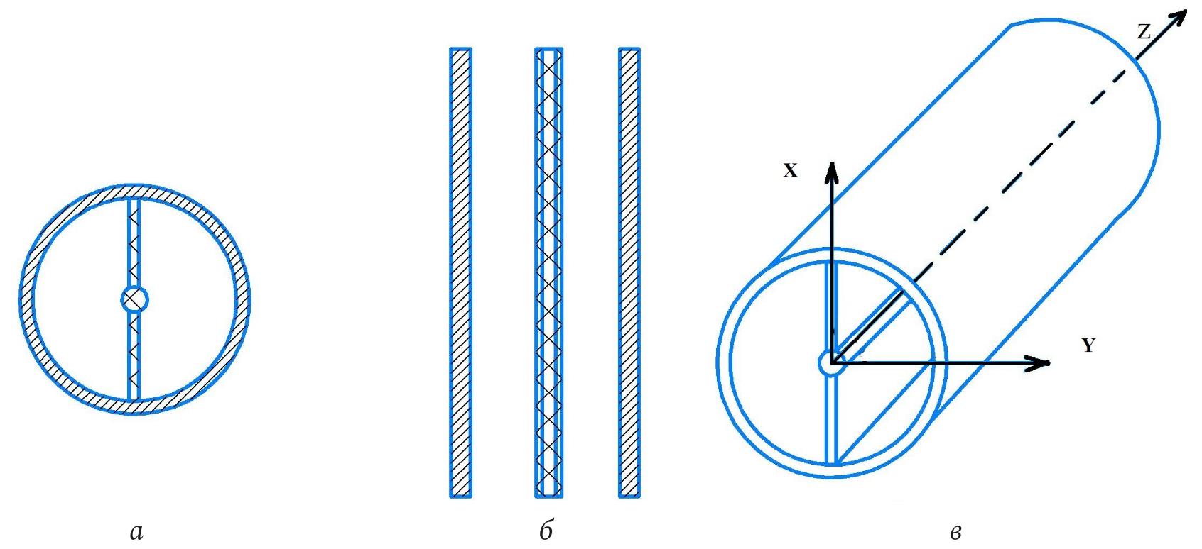 Рис. 1. Базовая конструкция волноведущего тракта: а – поперечное сечение волновода; б – продольное сечение волновода; в – волновод в декартовой системе координат
