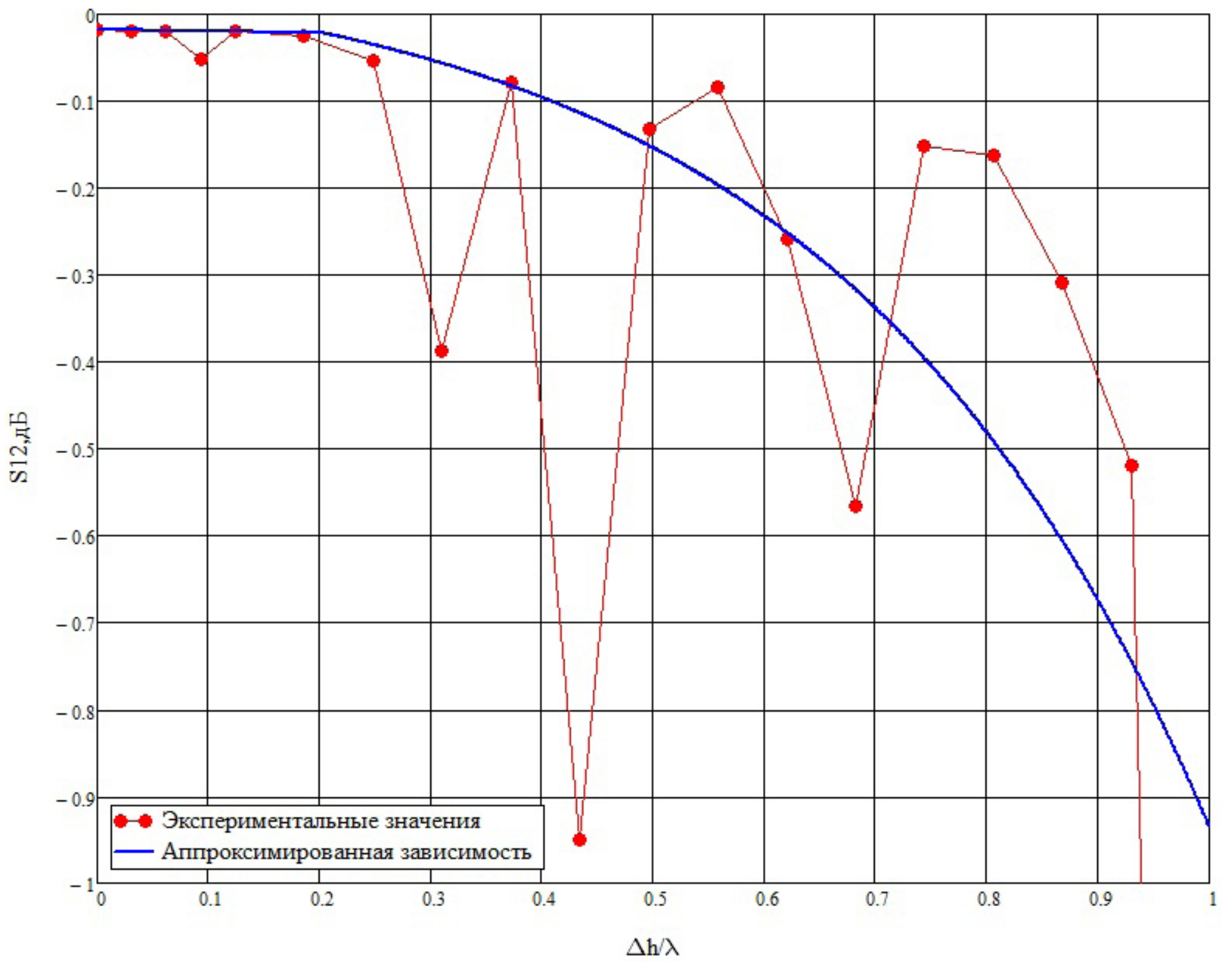 Полученные в ходе работы зависимости передаточных характеристик металлодиэлектрического волновода от величины нерегулярности показали, что с увеличением сдвига наблюдается рост потерь, вызванных модовым преобразованием волны и ее переотражением от нерегулярного участка. Указанные явления вносят дополнительные ограничения при сборке и стыковке волноведущих функциональных узлов на экранированном диэлектрическом волноводе. Так, при сдвиге более чем на передаточная характеристика уменьшается большее чем на 0,1 дБ. Наиболее «опасный» сдвиг наблюдается в поперечной плоскости и приобретает экспоненциальную зависимость.