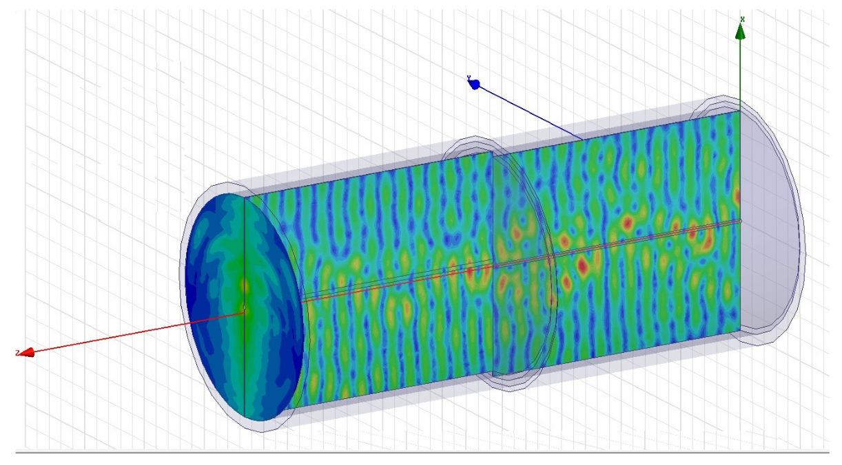 Нерегулярность типа сдвиг волноведущего тракта по оси представлена на рис. 8, а также распределение поля на частоте 93 ГГц. Протекание волны через нерегулярный участок сильно деформирует структуру поля, возникают колебания высших мод. При этом основная часть энергии поля сосредоточена в области диэлектрического цилиндрического стержня и значительно ослабевает к его краям.