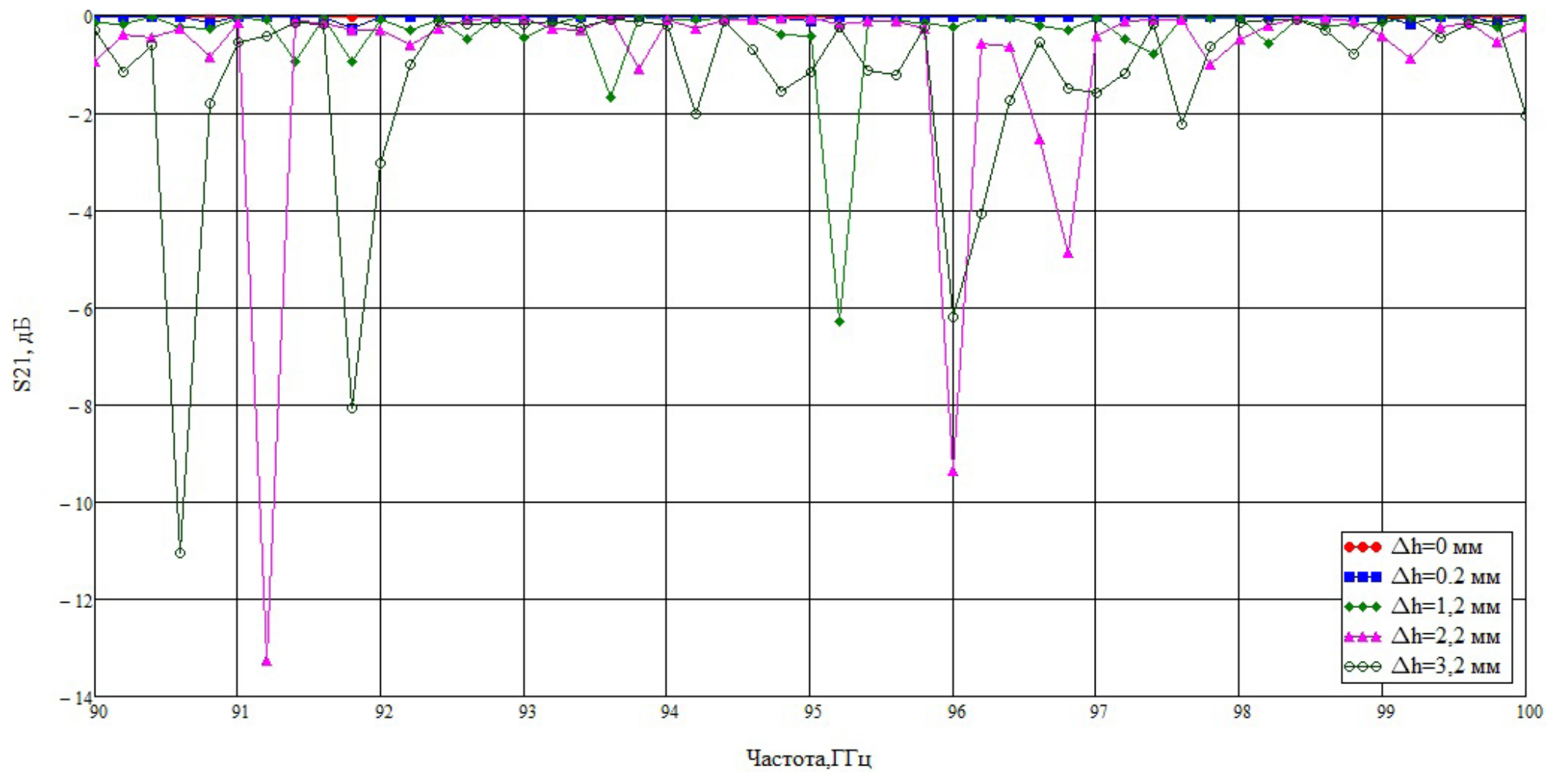 Характер зависимостей S12 от частоты приведен на рис. 6. Из графиков видно, что передаточная характеристика при малых сдвигах мм монотонна и близка к значениям передаточной характеристики тракта без нерегулярности.
